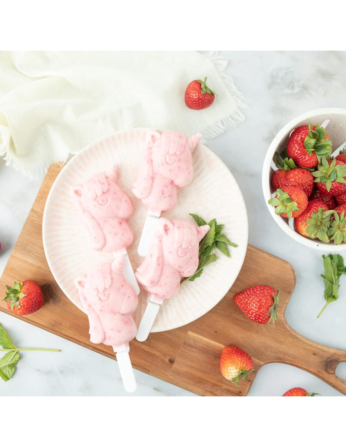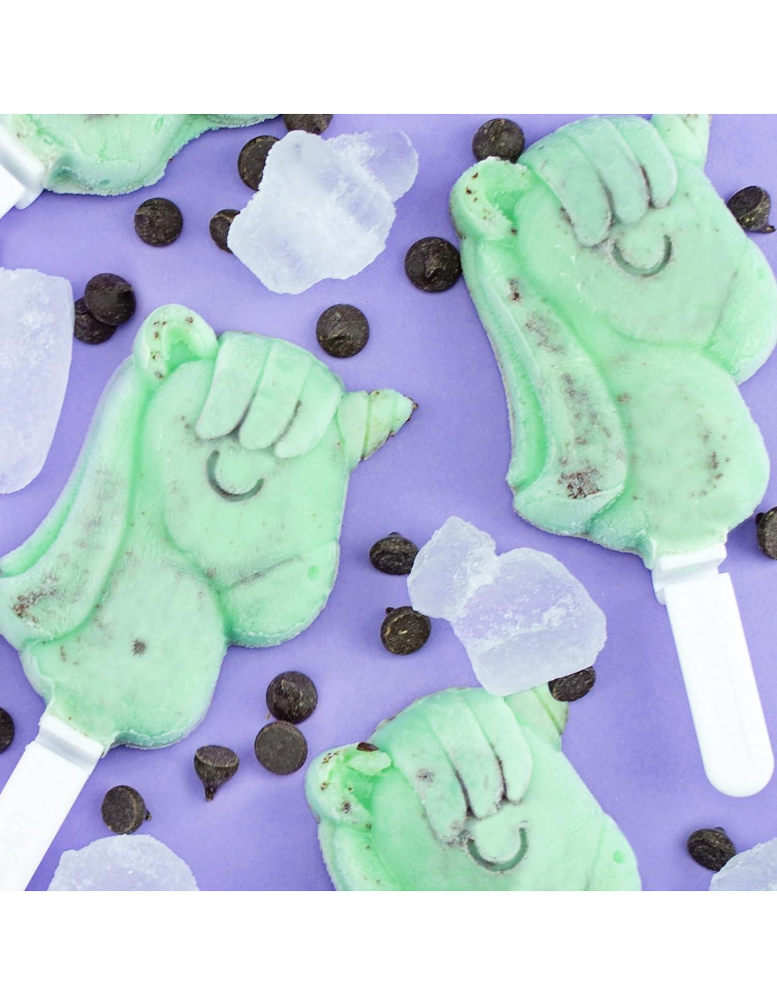 - CUATRO MOLDES DE UNICORNIO: Cada bandeja tiene cuatro (4) moldes de helado de silicona en forma de unicornio de 2.5 onzas líquidas (73.93 mililitros) con palitos y tapa