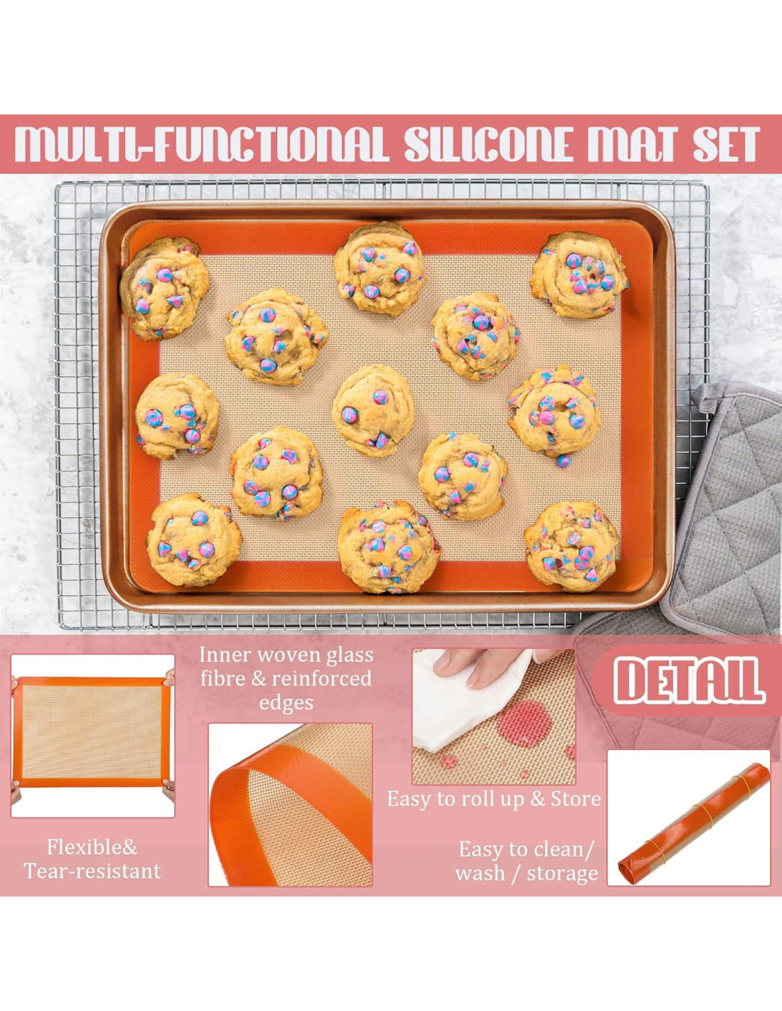 - Diseño Grande y Antiadherente: las alfombrillas de silicona para hornear son aproximadamente 16.5 x 11.6 pulgadas (42 x 29.5 cm) y se adaptan a la mayoría de las bandejas para hornear de media hoja de 13 x 18 pulgadas, además las alfombrillas de horno de silicona son antiadherentes y se pueden lavar fácilmente con un paño húmedo y agua jabonosa
