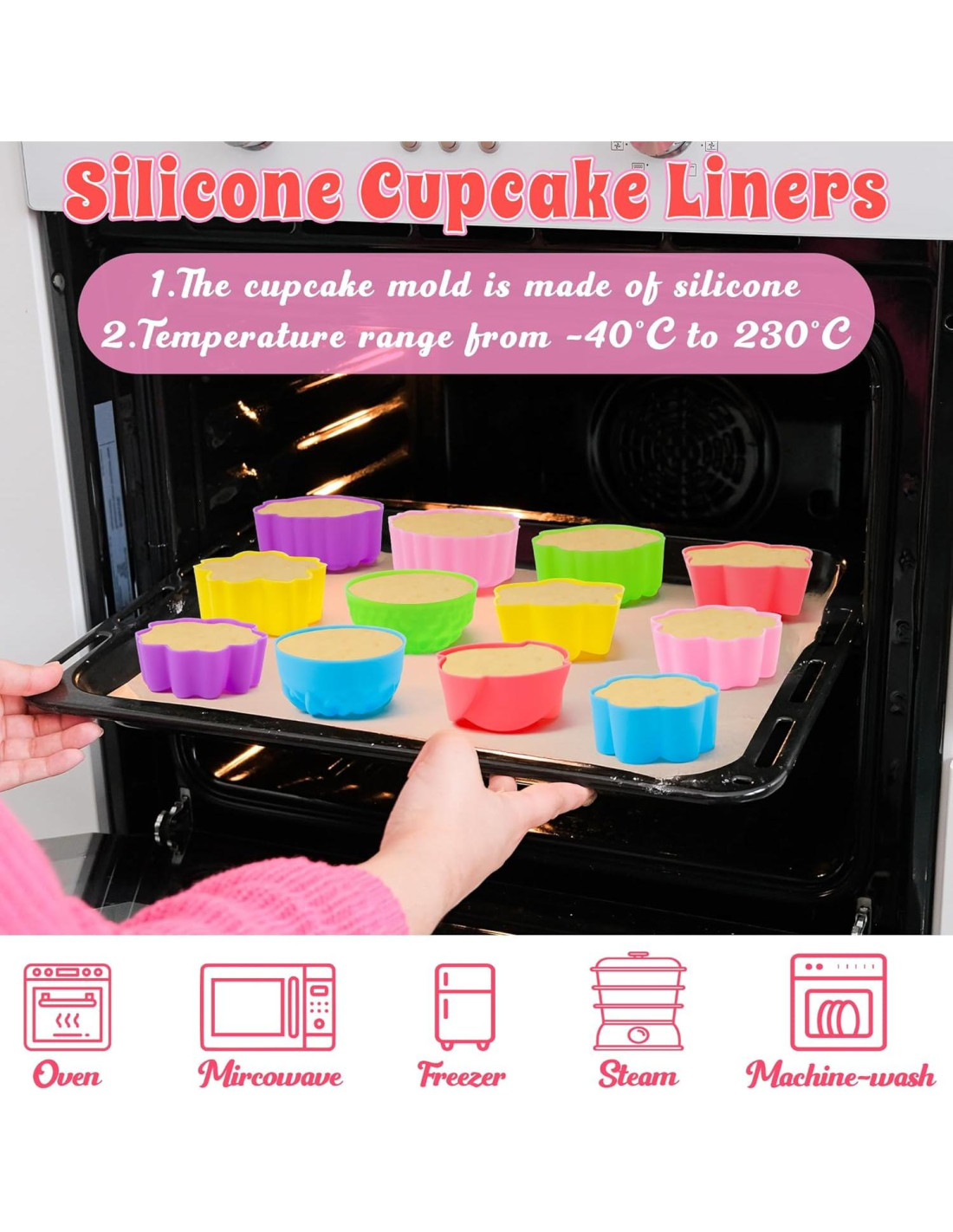 - RESISTENTE AL CALOR: Hecho de silicona de primera calidad, es antiadherente y también mantiene bien su forma original. Los alimentos refrigerados se pueden quitar fácilmente sin romperse, y se pueden reutilizar en lugar de usar tazas de papel desechables. Seguro para usar entre -40 y 230 grados Celsius. Apto para horno, congelador, microondas y lavavajillas.