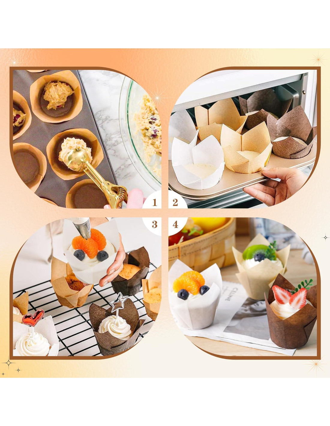 - Material Confiable: Nuestros forros de cupcake tulipán están diseñados para soportar altas temperaturas de hasta 220C, lo que los hace perfectos para hornear cupcakes y muffins. Ya sea que estés usando un horno o un microondas, ten la seguridad de que este forro de cupcake puede manejar el calor. Además, los moldes para hornear son seguros para usar en refrigeradores, proporcionando flexibilidad en el almacenamiento de tus productos horneados