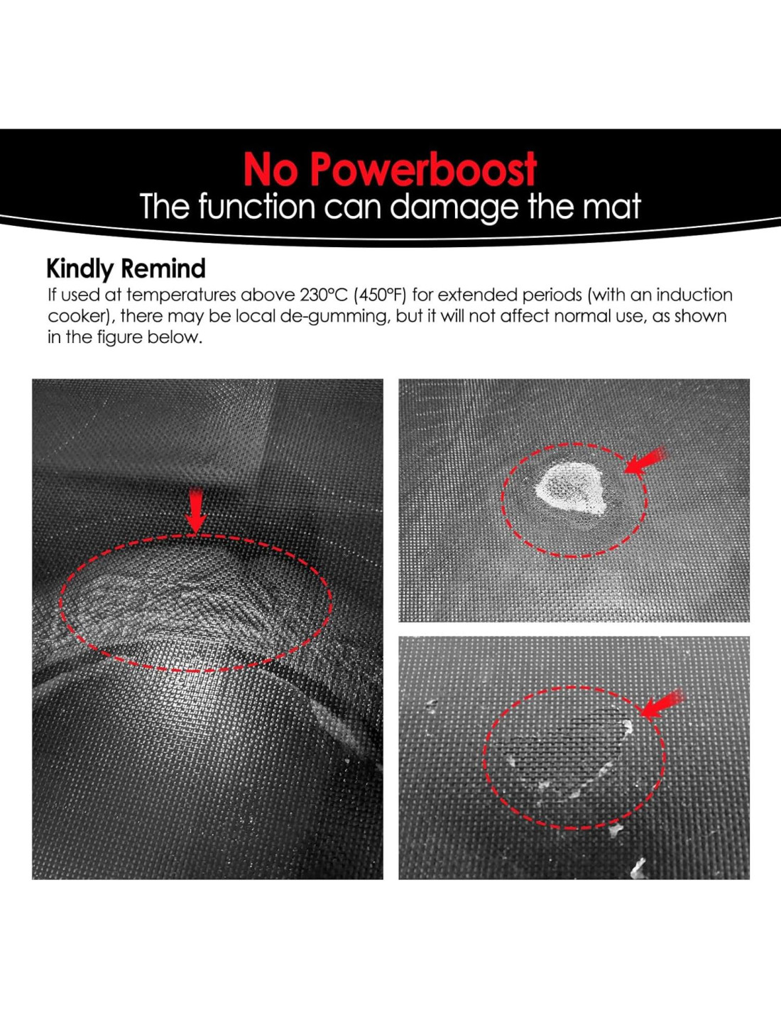- NUEVA MEJORA SILICONA DE GRADO ALIMENTICIO PLATINO - Hecho de fibra de vidrio especialmente diseñado recubierto con silicona líquida de grado alimenticio (libre de BPA), reutilizable, 100% resistente a los adhesivos, y resistente al calor hasta 232C (450F). Si se usa a temperaturas superiores a 230C (450F) durante períodos prolongados (con una cocina de inducción), puede haber despegue local, pero no afectará el uso normal.