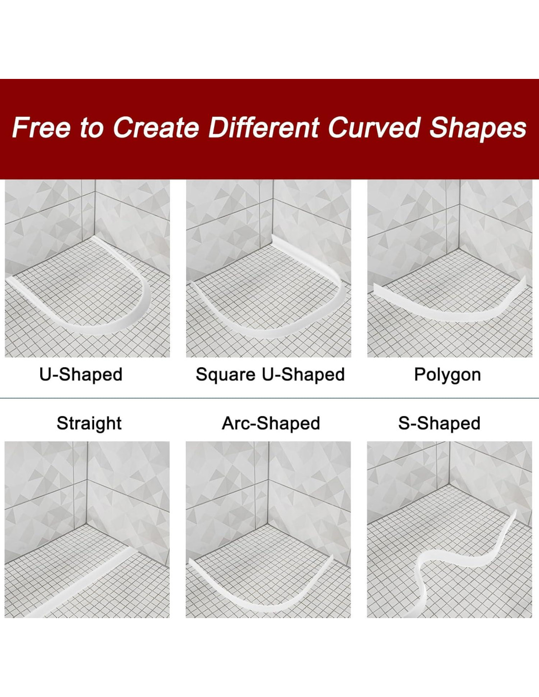 - [Diseño Práctico] - Nuestra barrera de agua para ducha tiene un diseño en forma de abanico con material suave que puede crear fácilmente varias formas curvas y cortarse a la longitud que necesites. Además, viene con un respaldo autoadhesivo que ayuda a asegurar que la barrera se mantenga firmemente en la superficie, creando un sello impermeable que separa lo húmedo de lo seco, evitando que el agua se filtre fuera del área de la ducha.