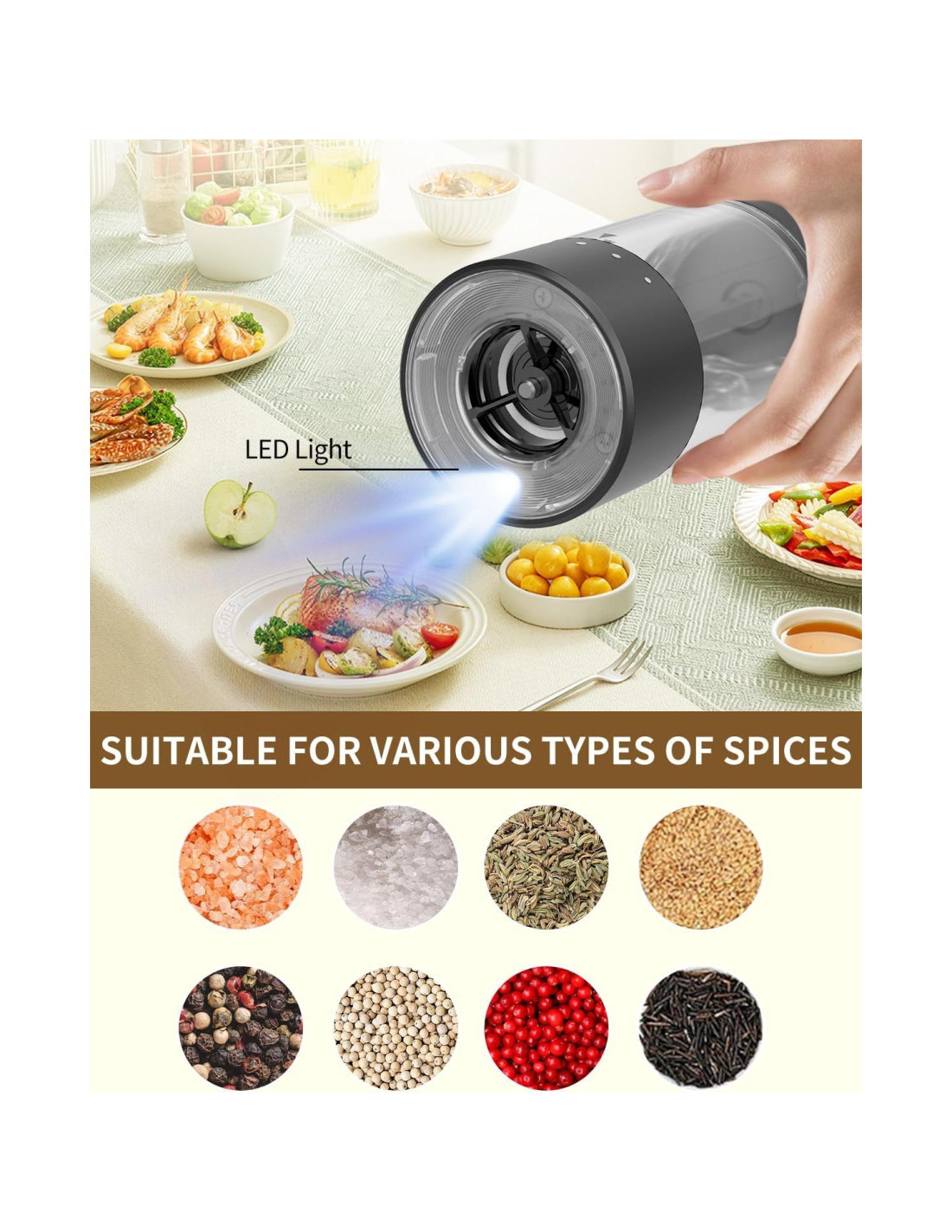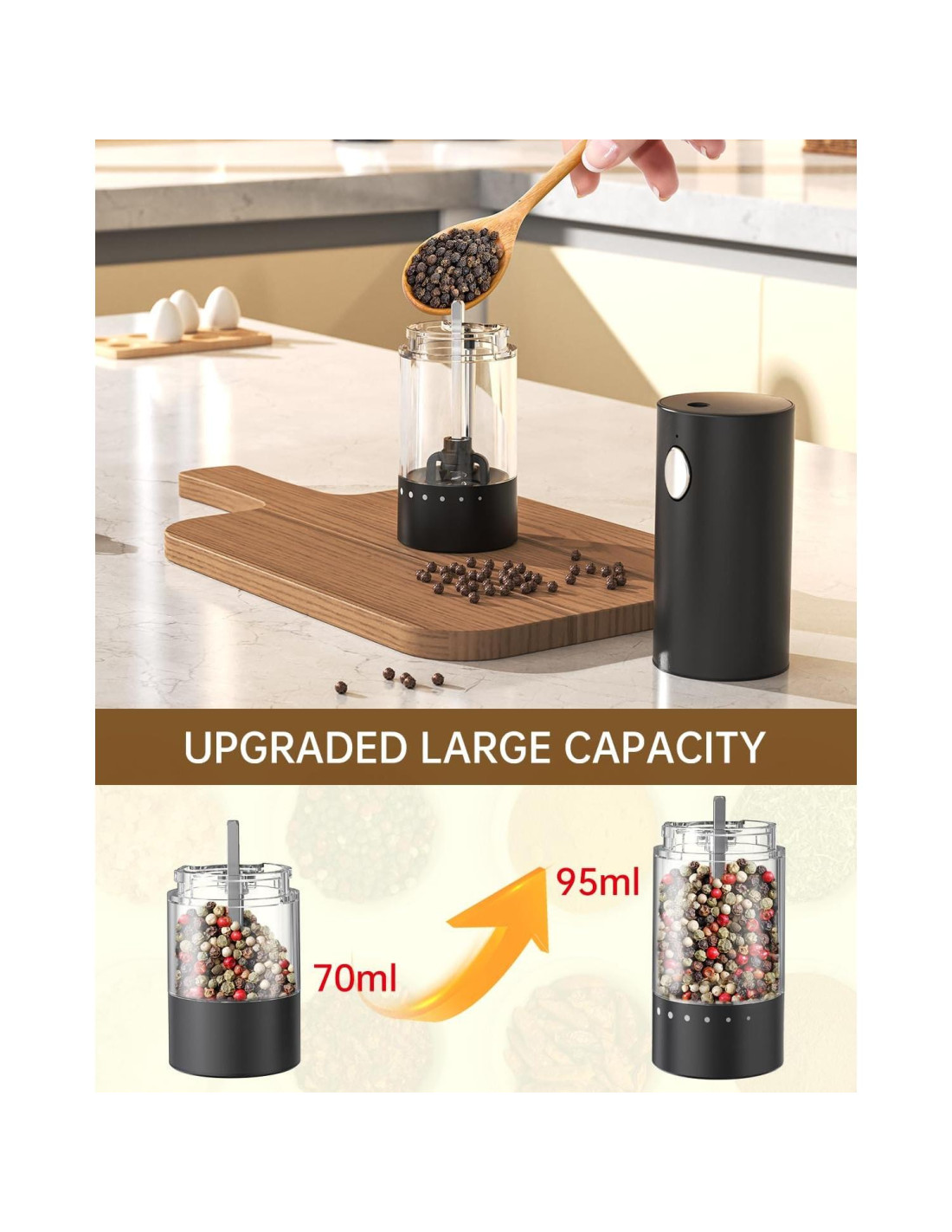 - Mayor Capacidad de 95ML - El molinillo de pimienta eléctrico cuenta con un contenedor transparente, lo que te permite monitorear fácilmente los niveles de condimento y distinguir entre diferentes especias. La gran capacidad de 95ML reduce la necesidad de recargas frecuentes, haciendo que la preparación de comidas sea más conveniente