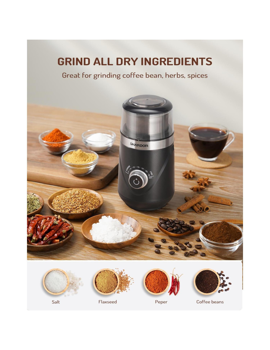 - Molienda de Múltiples Ingredientes: muele fácilmente granos de café, especias, granos y otros ingredientes secos como vainilla, pimienta, canela, anís, linaza, nueces y sal gruesa