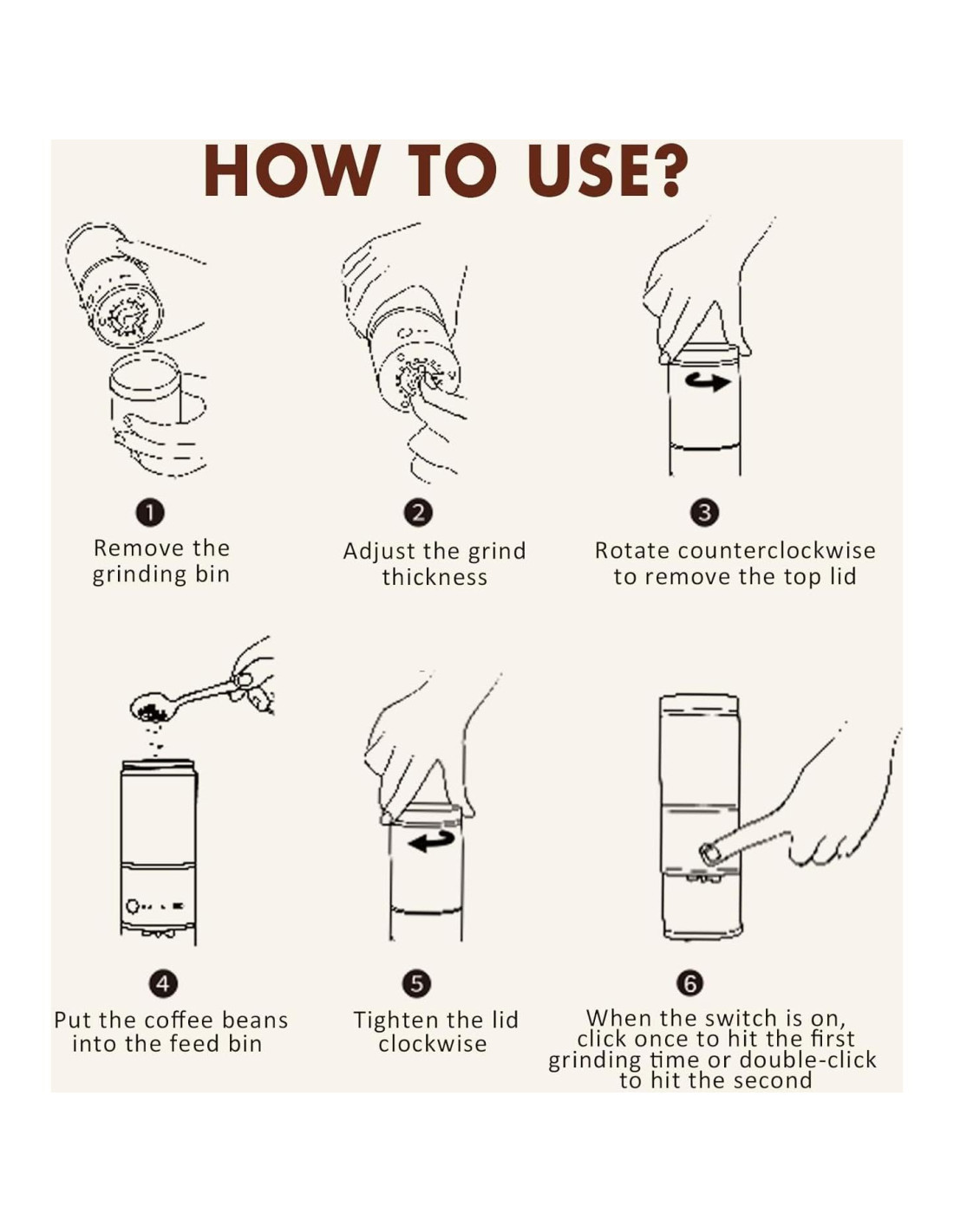 - RENDIMIENTO EFICAZ DE LA BATERÍA: Con un tiempo de carga rápido de 45 minutos, nuestro molinillo de café portátil muele 15 gramos de café hasta 40 veces una vez completamente cargado. Y la función de carga rápida te proporciona 3 tazas de 15g de café por 3 minutos de carga. Haciéndolo un compañero ideal para viajes de camping, viajes o siempre que necesites una taza de café fresca sobre la marcha