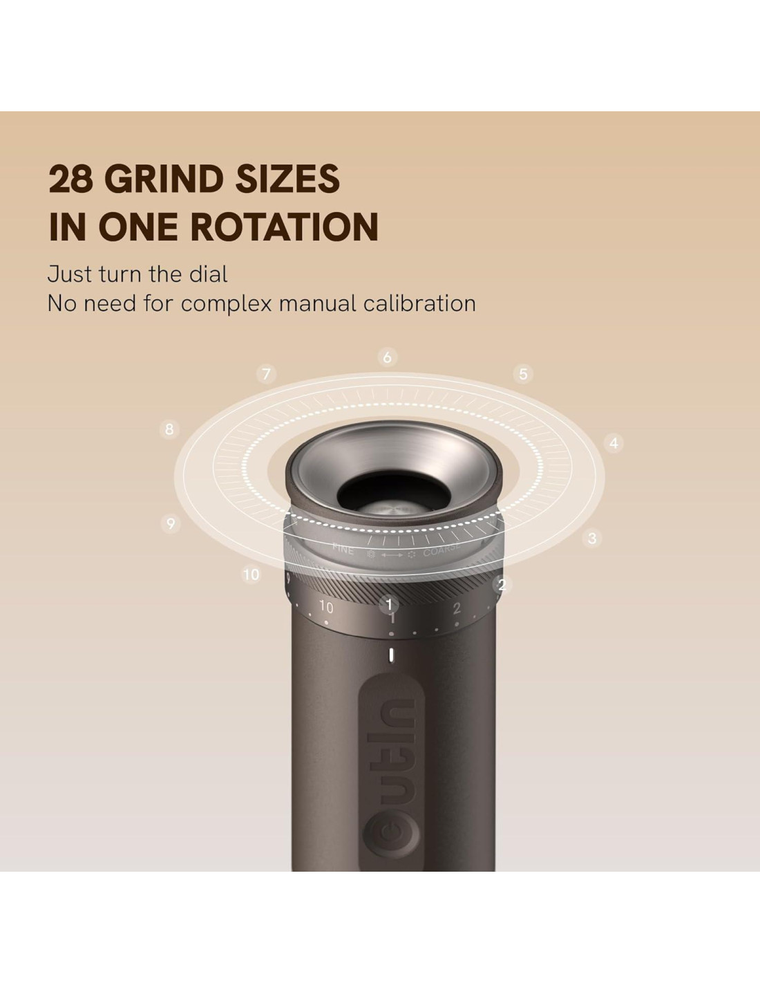 - [28-POSICIÓN DE MOLIENDA] El molinillo de café eléctrico portátil OutIn Fino cuenta con un dial de precisión patentado de 28 posiciones que cubre todo el espectro de estilos de café, desde espresso ultra-fino hasta prensa francesa gruesa, en solo un giro suave.