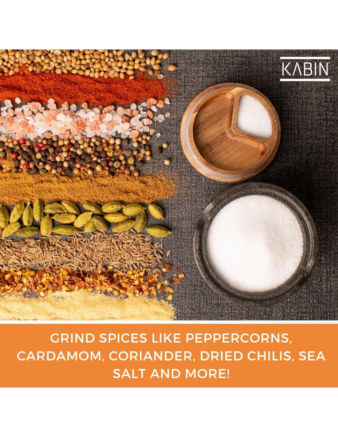 - SALERO PARA ALMACENAMIENTO - Almacena sal o especias dentro del compartimento del Molino de Especias KABIN. La tapa está hecha de madera de acacia 100% natural con una junta de goma para mantener la frescura. ¡Este es un molinillo de especias manual multifuncional y triturador de hierbas!