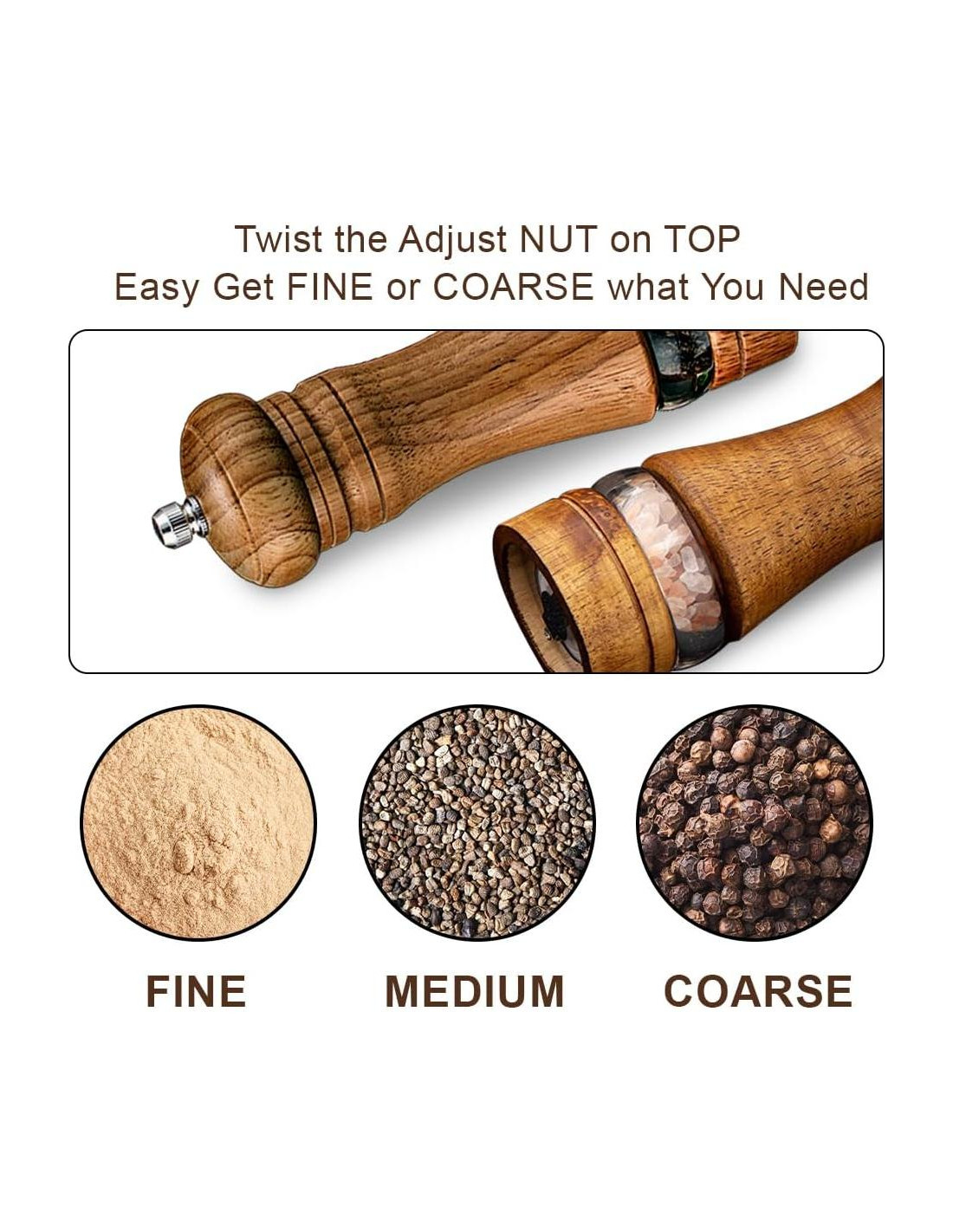 - Fino o Grueso: Gira la tuerca ajustable en cada molino de sal y pimienta para personalizar el grosor exactamente a tu gusto; Ideal para moler sal marina, granos de pimienta y más; Una ventana visible facilita comprobar cuánto queda de las especias.
