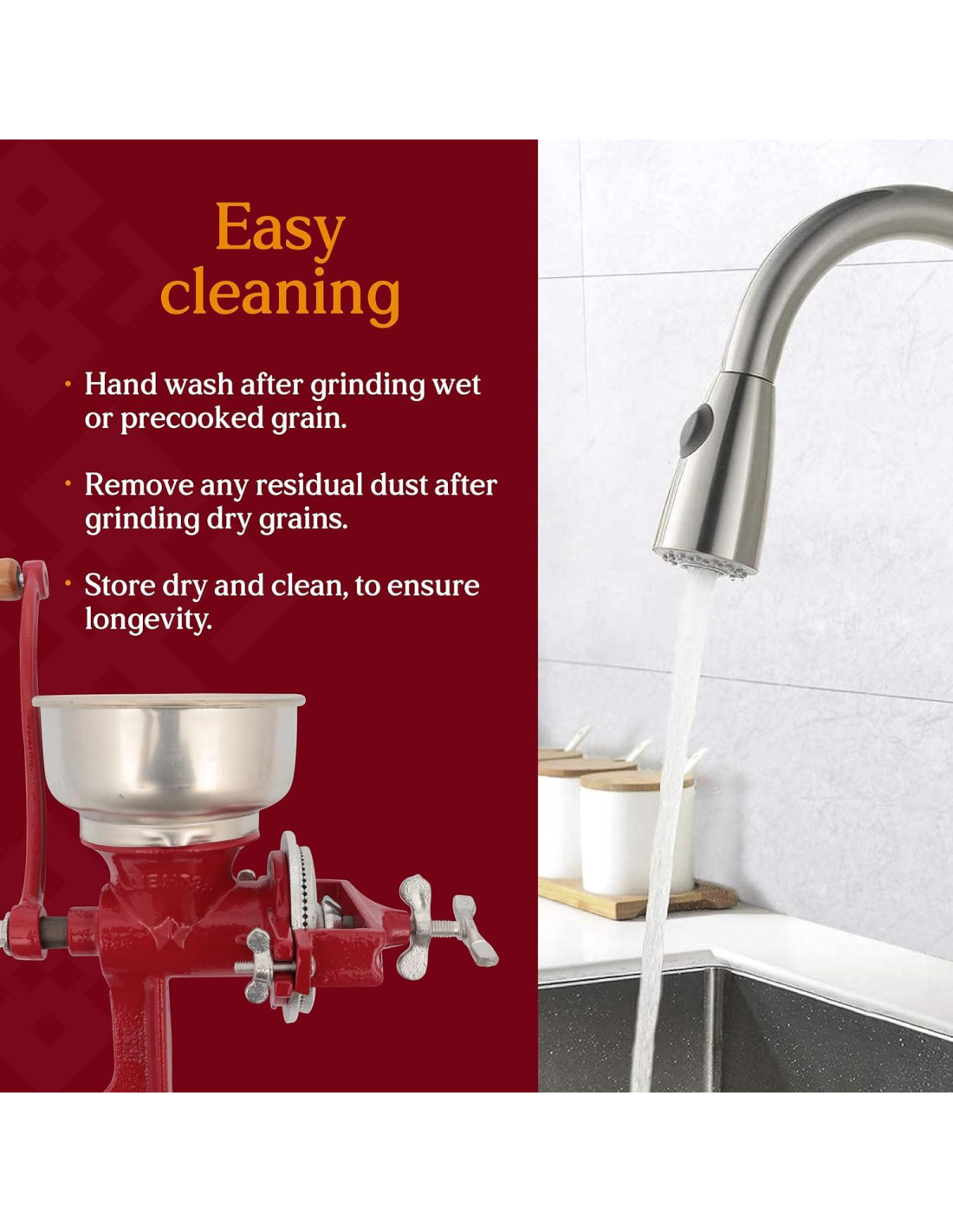 Perfecto para moler pequeñas a medianas cantidades de grano/maíz. Este molinillo de hierro fundido de alta calidad es lo suficientemente resistente para garantizar un rendimiento duradero. No se requieren herramientas, solo coloque el molino en una encimera y comience a colocar cada pieza como se indica en el manual.