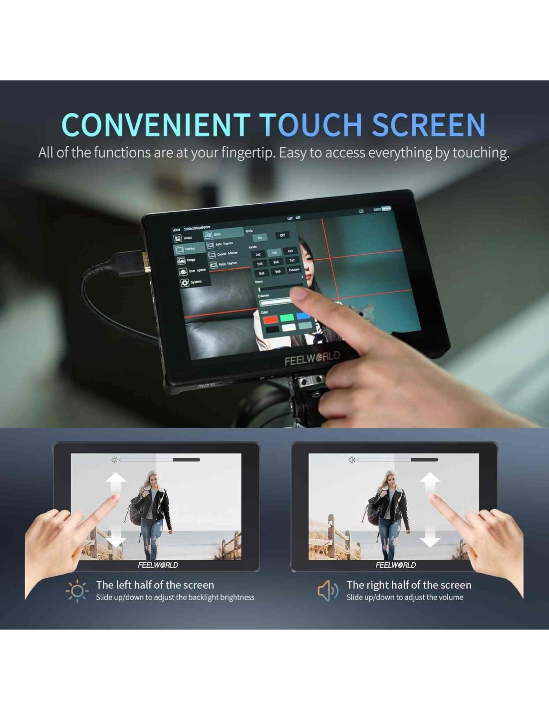 - [MONITOR HDMI 4K EN SITIO] El monitor F7 PLUS DSLR es un monitor de cámara de pantalla táctil de alta brillo de 7 pulgadas. HDMI admite hasta 4K60Hz, lo que te permite experimentar la suavidad de la transmisión de alta velocidad. Hay un kit de instalación y alimentación externa NP-F en la parte trasera del F7 PLUS, que puede ser como transmisión inalámbrica, luz LED, etc. Combina el monitor con transmisión inalámbrica para deshacerse de cables innecesarios, lo que es perfecto para el monitoreo del director, 1er AC para el enfoque en el equipo de filmación.