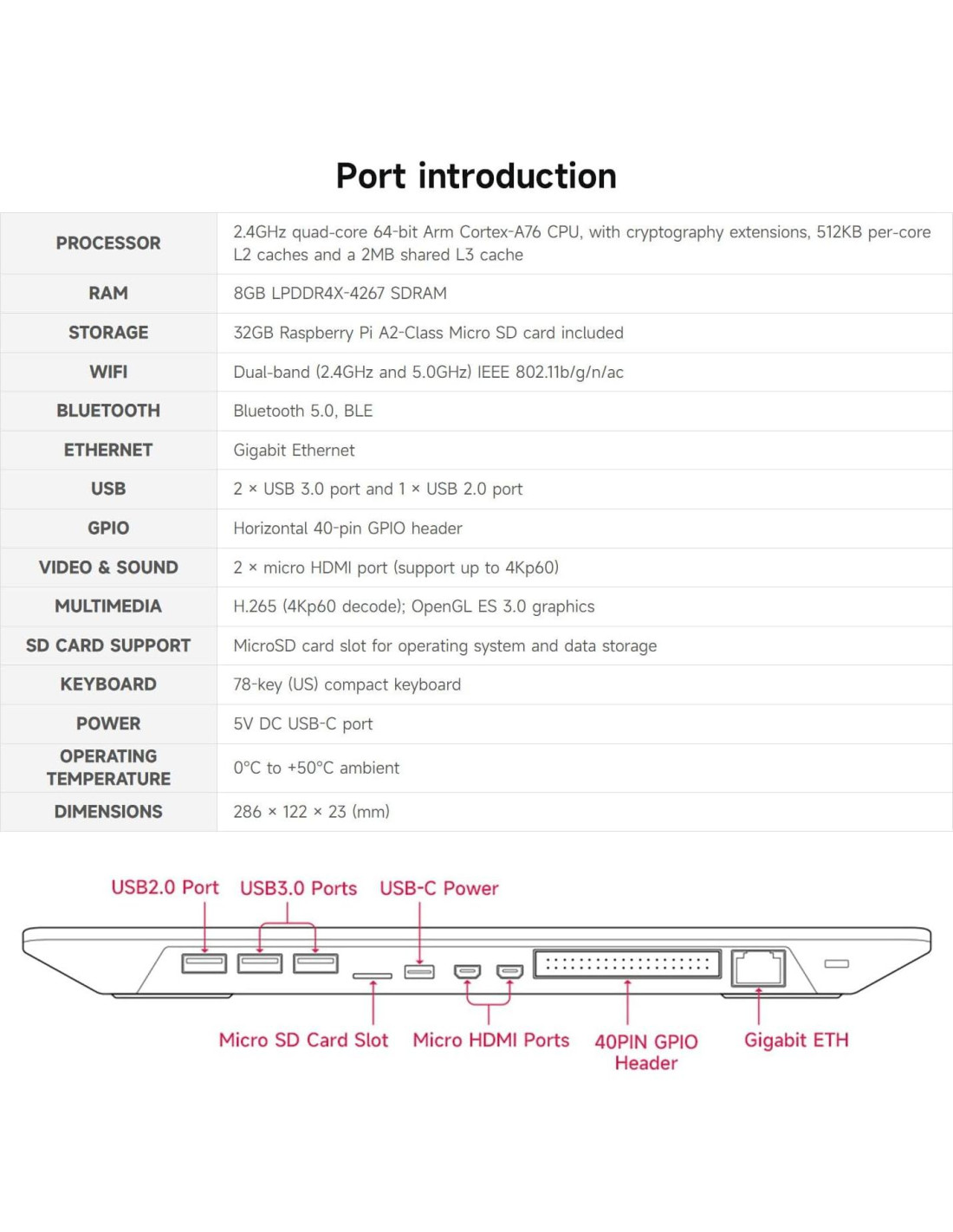- CPU quad-core de 64 bits Arm Cortex-A76 a 2.4GHz, con extensiones de criptografía, cachés L2 de 512KB por núcleo y una caché L3 compartida de 2MB