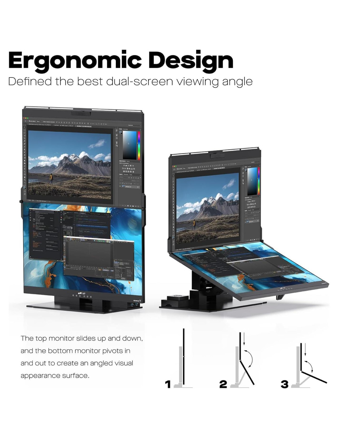 - Diseño Ergonómico, Fácil de Usar: El monitor de computadora plegable se puede inclinar infinitamente con el monitor superior deslizándose hacia arriba y hacia abajo y el monitor inferior rotando hacia adentro y hacia afuera, Los monitores duales para escritorio son compatibles con una amplia gama de dispositivos