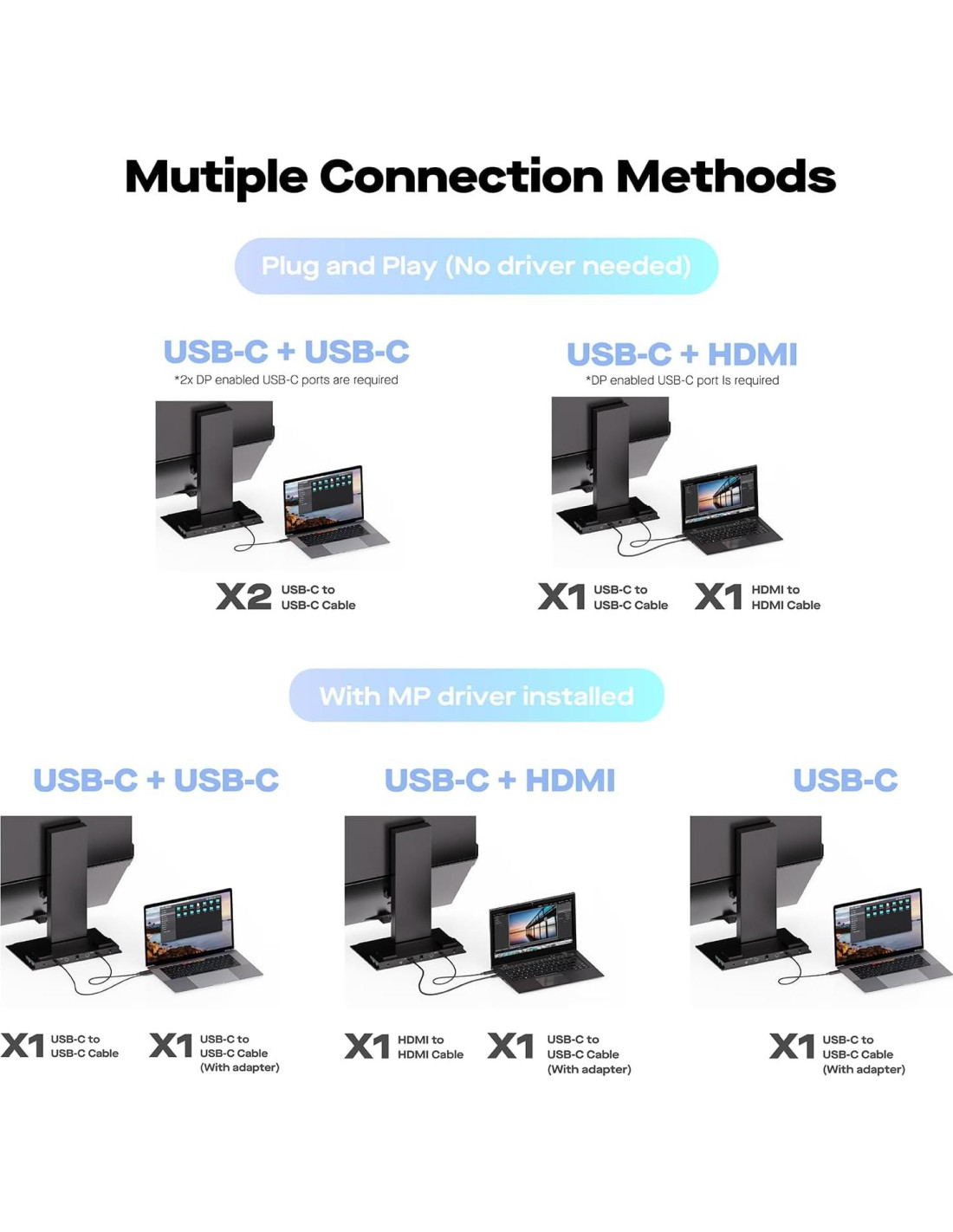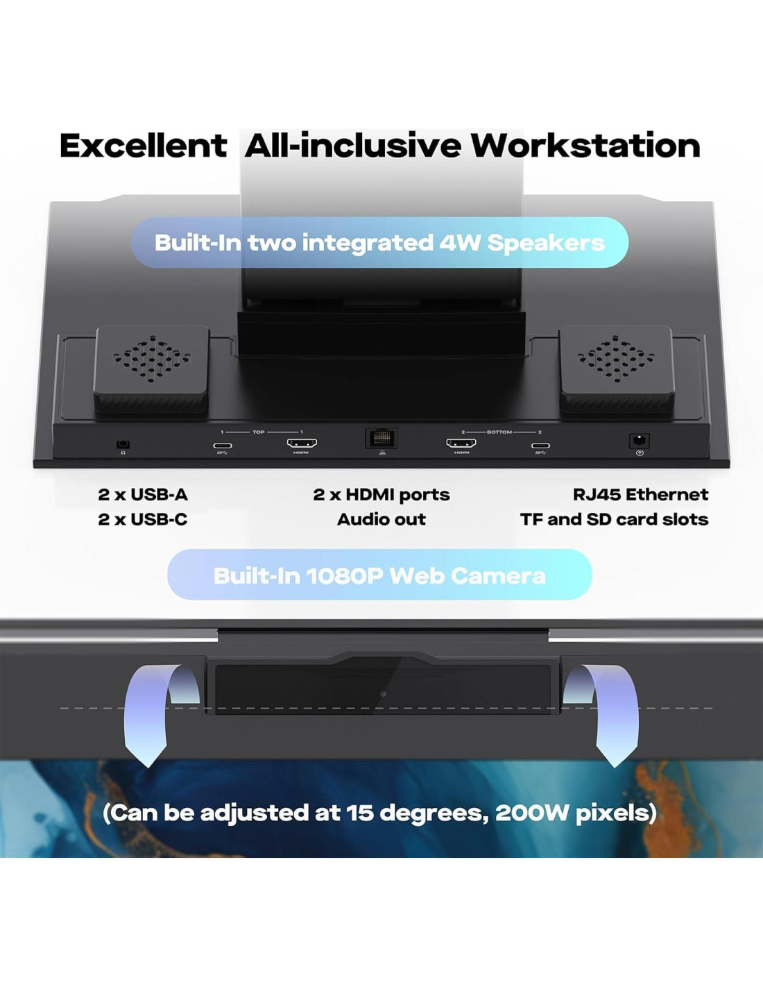 - Estación de Trabajo Innovadora Todo Incluido: Geminos T cuenta con una cámara web 1080P integrada, un par de altavoces de 3W, una estación de acoplamiento 10 en 1; La estación de acoplamiento ofrece (2) USB-A, (2) USB-C, (2) HDMI, (1) Ethernet, (1) Jack de salida de audio, (1) Ranura SD, (1) Ranura TF