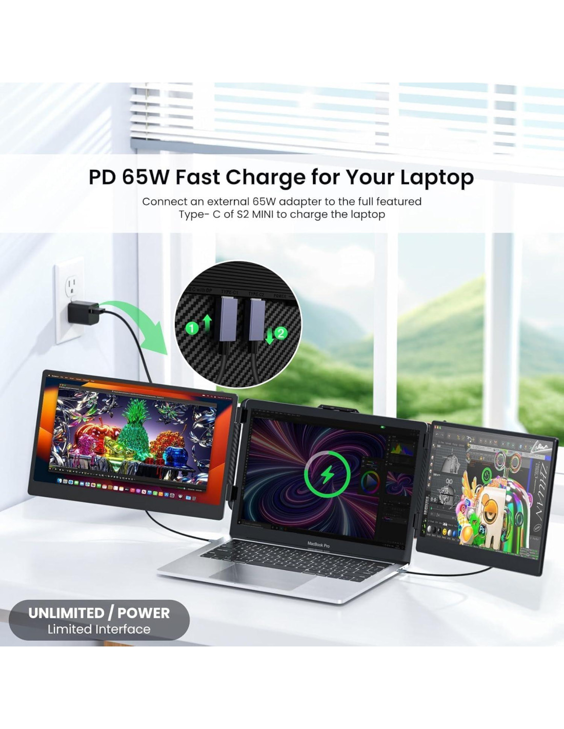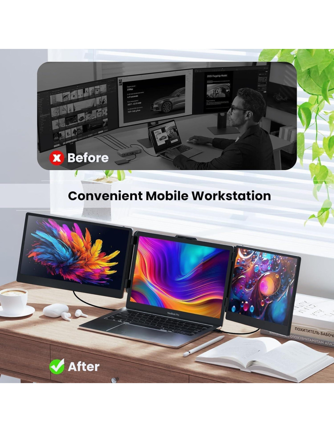 - Portátil: El monitor portátil triple para laptop es un compañero conveniente que se conecta sin problemas a tu laptop sin necesidad de accesorios adicionales. Soporta pantallas de laptop de hasta 405 mm (15.9 pulgadas) de ancho y cuenta con un soporte ajustable para estabilidad. Con un peso de solo 2.8 lbs (1.27 kg), este extensor de monitor para laptop ultra portátil se ajusta perfectamente en la bolsa, lo que lo hace ideal para viajar.