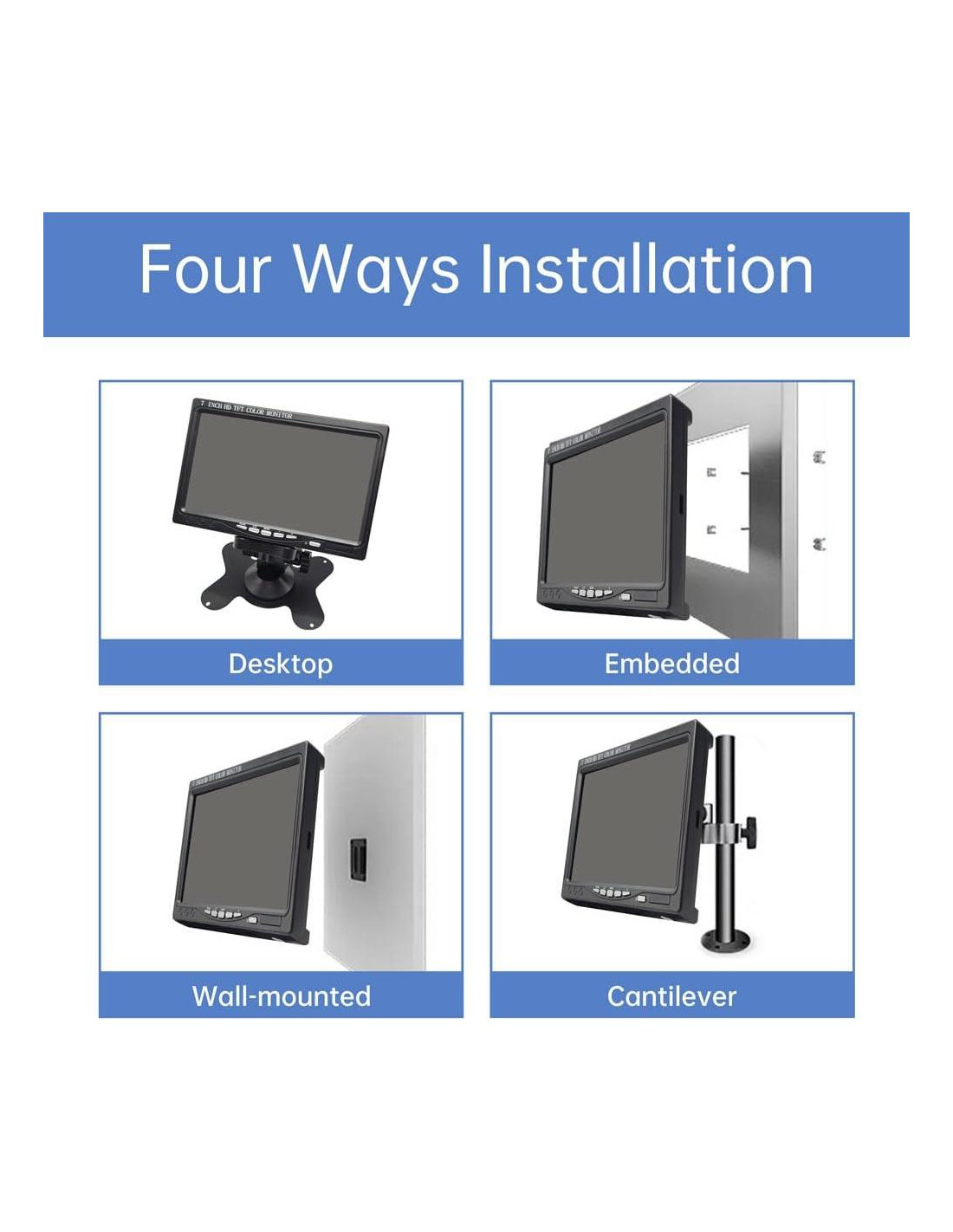 - Fácil operación e instalación: Fácil de operar, la máquina tiene botones multifuncionales, y viene con un control remoto y soporte. Además, la pantalla se puede quitar del soporte del monitor para ciertas aplicaciones. Usado para escritorios en casa, equipos industriales, aplicaciones de monitor de seguridad y sistema de cámara de respaldo de vehículo móvil de coche/camión, se puede instalar en un escritorio o colgar.