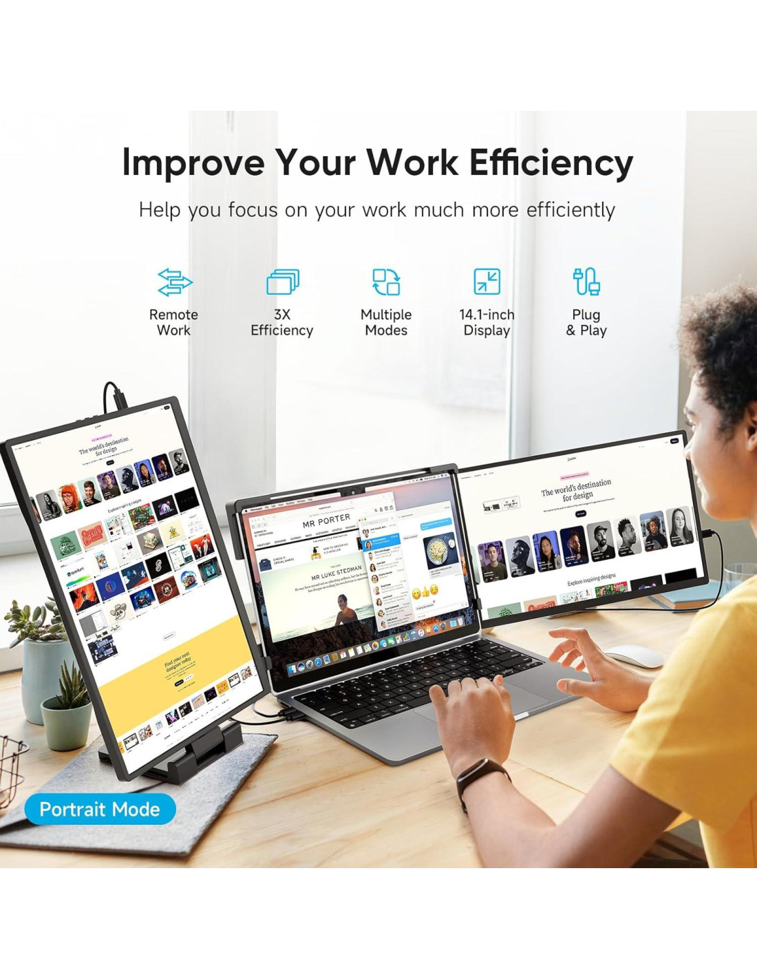 - [Extensor de Pantalla de Laptop Portátil para Productividad] Debido a un tamaño decente, diseño desmontable y plegable, el extensor de pantalla triple Dopesplay de 14.1" se adapta fácilmente a su mochila de viaje. Fácil de llevar e instalar. Las posiciones de pantalla vertical/horizontal ofrecen más comodidad para su trabajo diario. Un imprescindible para viajes de trabajo si está acostumbrado a múltiples pantallas.