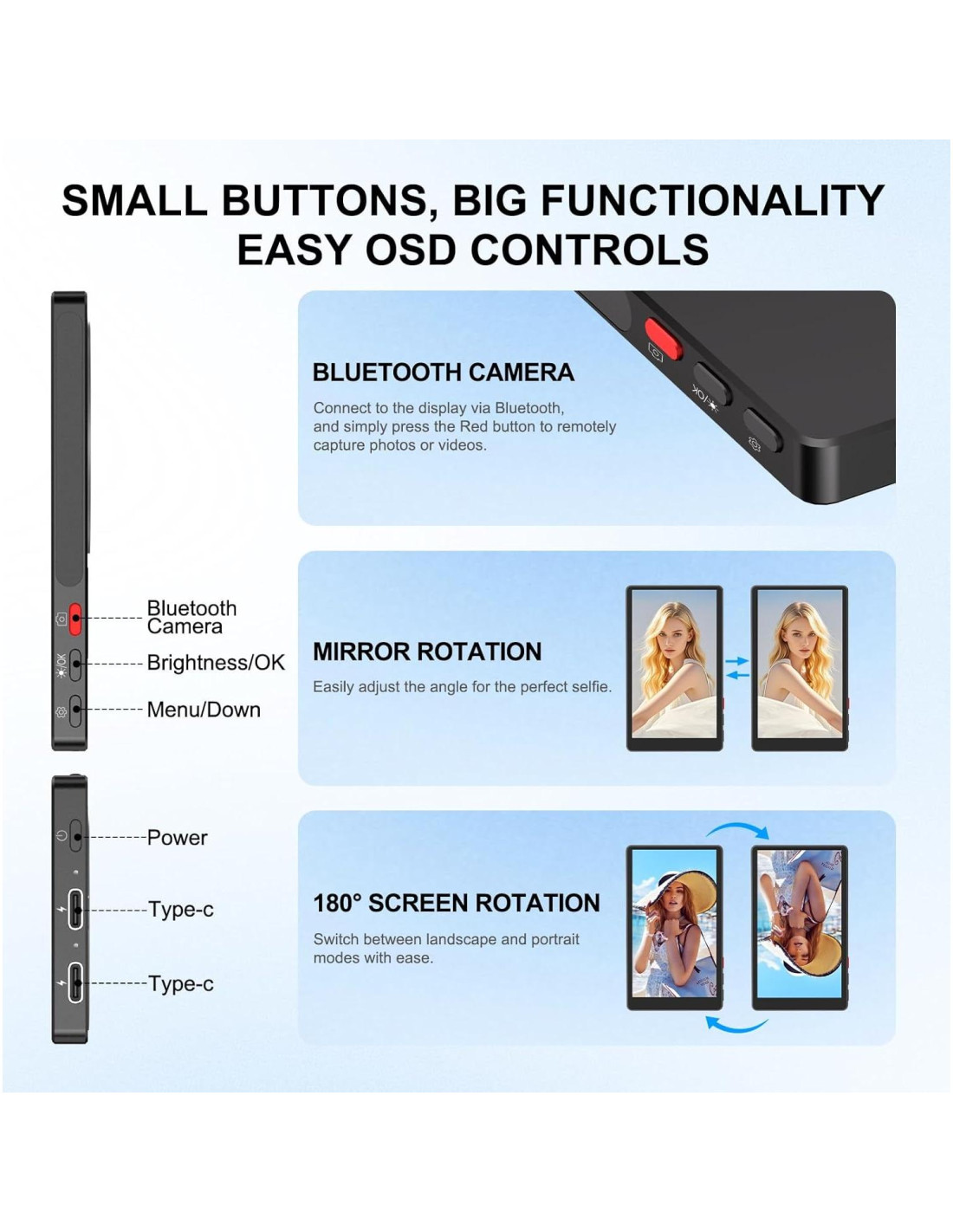 - Control de Selfie OSD de Siguiente Nivel y Cámara Remota: Lleva tus selfies al siguiente nivel con el monitor selfie de 4 pulgadas. Emparejalo a través de Bluetooth y utiliza el elegante botón de obturador rojo en la pantalla secundaria para tomar fotos de forma remota; ¡nadie más ofrece esto! Además, está repleto de características: gira la pantalla de izquierda a derecha o de arriba a abajo, ve en pantalla completa, ajusta la temperatura de color y el brillo, e incluso cambia de idioma sin esfuerzo. ¡Es tu compañero selfie todo en uno y fácil de usar! NOTA: Configura la región del monitor selfie de iPhone a tu ubicación actual antes de conectar. Una región incorrecta puede bloquear la duplicación de pantalla debido a límites de señal locales.