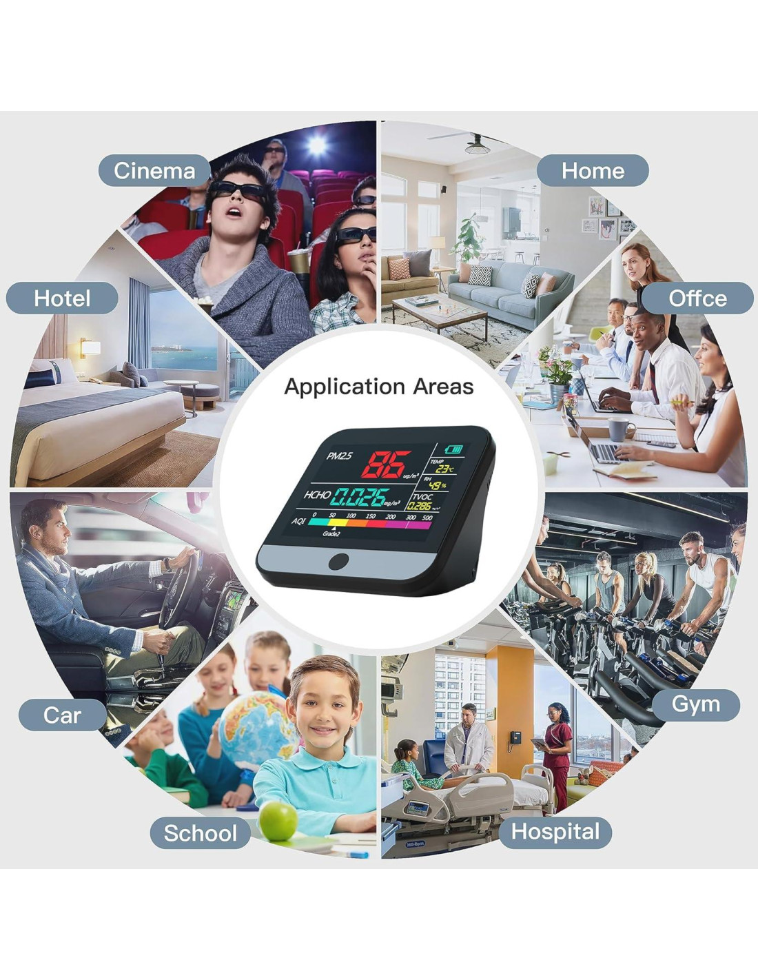 - [Probador de Calidad del Aire Multiusos]: Diseñado para un amplio espectro de entornos, desde hogares hasta lugares de trabajo y más allá. Ya sea que necesites una prueba de calidad del aire en tu dormitorio, sala de estar o cocina, o requieras monitoreo en espacios profesionales, vehículos, instituciones educativas, lugares de hospitalidad, áreas de almacenamiento, restaurantes, o incluso aventuras al aire libre, este dispositivo satisface tus necesidades de monitoreo de calidad del aire, tanto dentro como fuera.