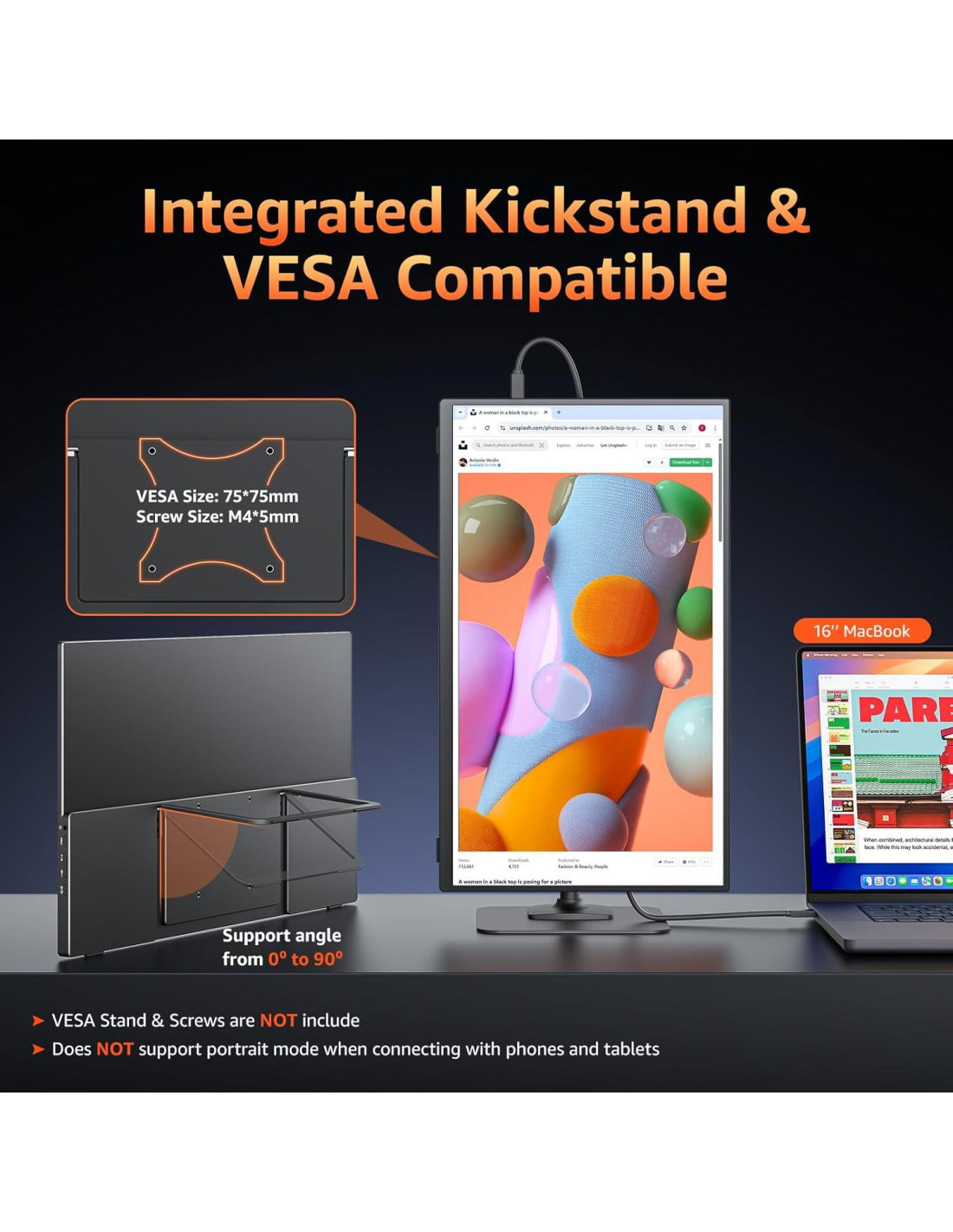 - [Monitor de Viaje con Soporte Integrado, Compatible con VESA]: El soporte integrado ajustable ofrece ángulos de visualización convenientes y lo hace perfecto para viajar. Con un soporte VESA estándar de 75x75mm, puede adjuntar fácilmente esta pantalla portátil a un soporte de monitor, ayudándole a ahorrar espacio valioso mientras mantiene la flexibilidad.