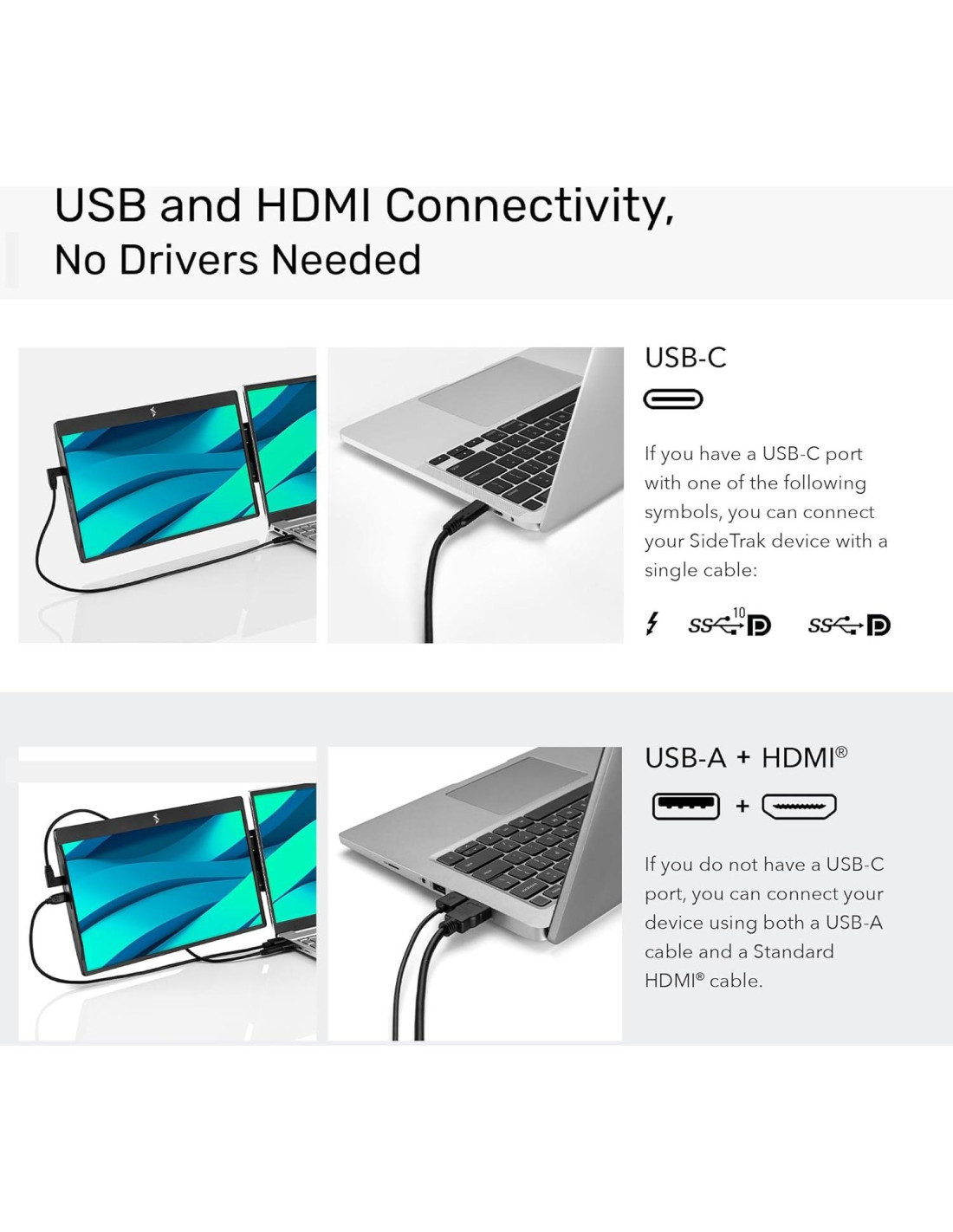 - Amplia Compatibilidad para Conexión Fácil - Conéctate a través de USB-C, USB-A o HDMI, sin necesidad de descargas o controladores adicionales. Esta pantalla portátil para laptop es compatible con Mac, PC y Chrome, lo que la convierte en la solución de doble monitor perfecta para usuarios en múltiples plataformas, asegurando una integración sin problemas con tu flujo de trabajo.