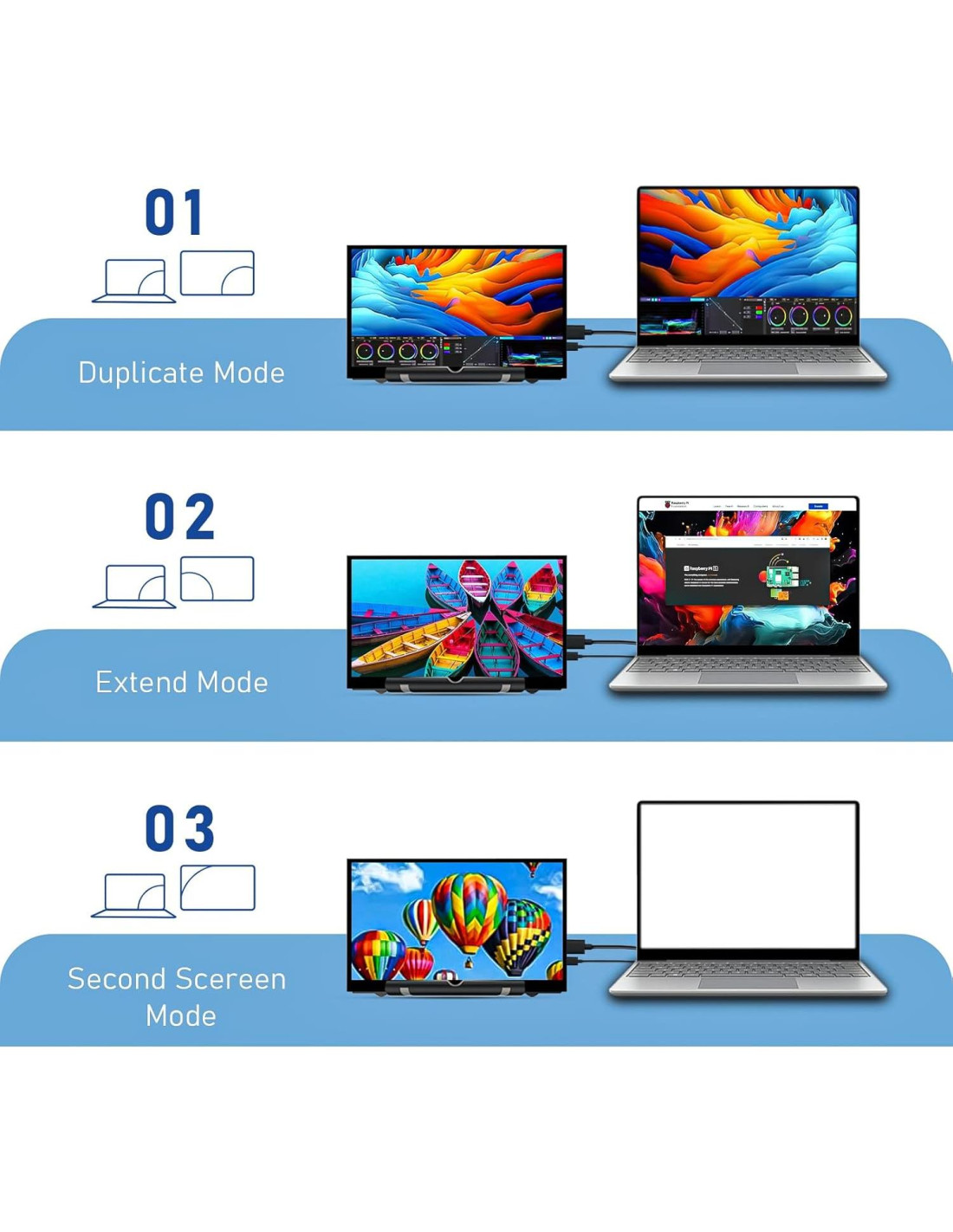 - Tres Modos de Aplicación para Laptop - Modo duplicado, modo extendido y modo de segunda pantalla. Cada modo tiene diferentes efectos de uso, brindando comodidad y ocio a tu trabajo y vida. Haz clic derecho en la configuración de pantalla en el escritorio de tu laptop, y luego selecciona tres modos de uso diferentes en la barra de configuración de múltiples pantallas según tus necesidades. Consigue un monitor para laptop ahora y siente una experiencia diferente. Nota: No es compatible con todos los modelos de Macbook.