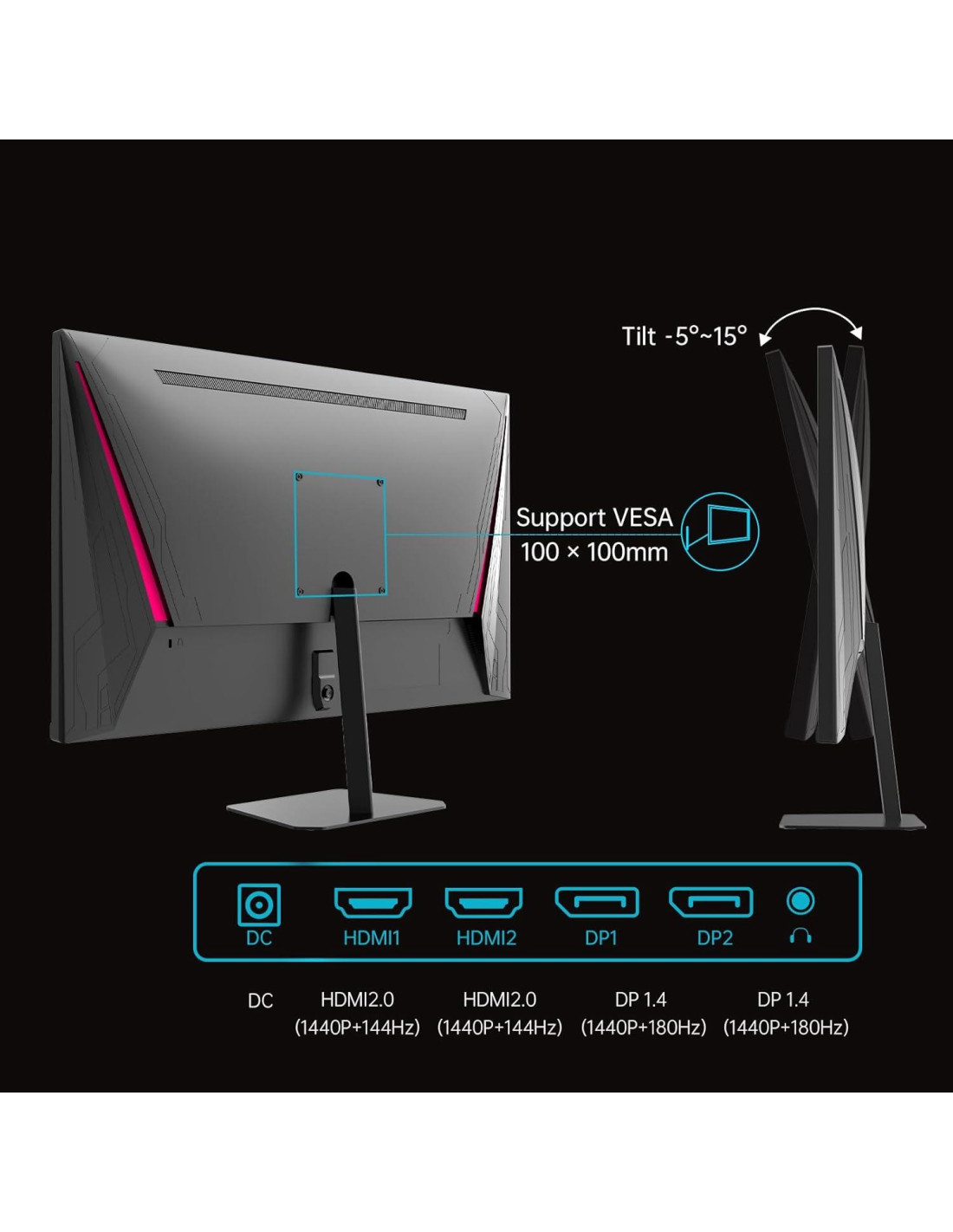 - Conexión Versátil Adopta interfaces HDMI2.0*2(144Hz), DisplayPort1.4*2(180Hz) y conector para auriculares de alto estándar. Soporta escritorios, laptops y otros dispositivos, para que puedas experimentar una transmisión de imagen de alta calidad.