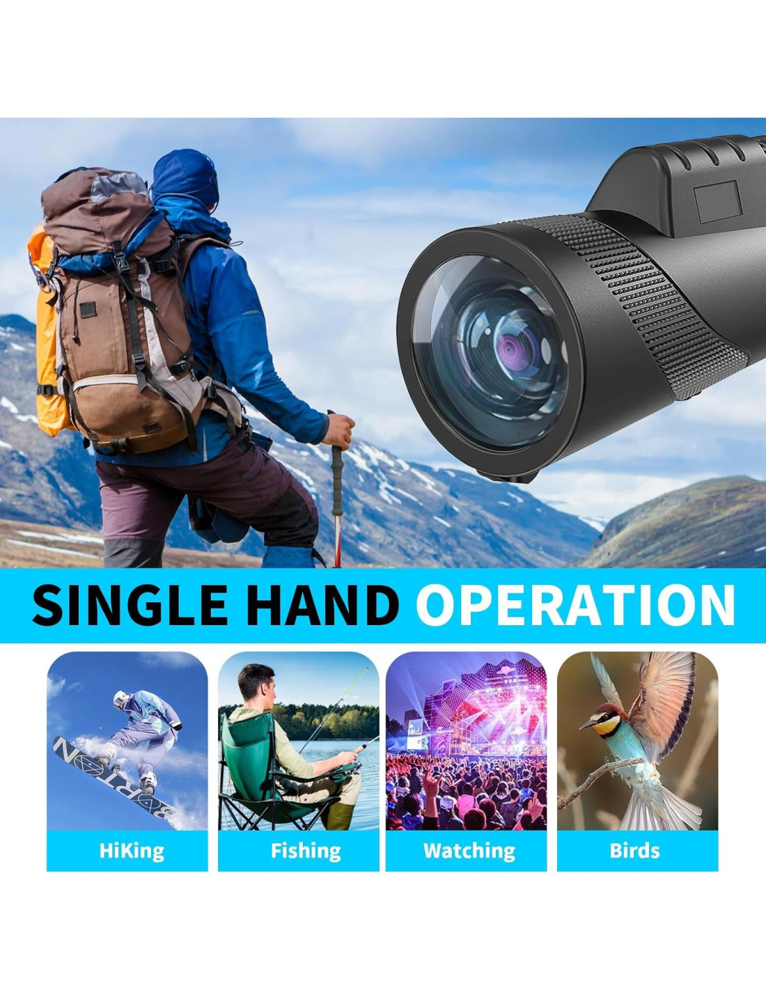 - Compacto y ligero para fácil portabilidad: Con un peso de solo 0.5 lbs (0.23 kg) y diseñado con un cuerpo elegante y del tamaño de un bolsillo, este monóculo es perfecto para su uso en movimiento durante senderismo, camping, viajes y eventos deportivos.