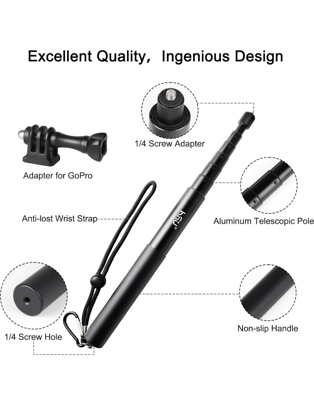 - Material de Alta Calidad Impermeable y a Prueba de Óxido: El monopod de mano está hecho de aluminio impermeable y a prueba de óxido, lo que hace que el agarre sea lo suficientemente estable y duradero para soportar tus cámaras de acción, permitiéndote disfrutar de todos los deportes.