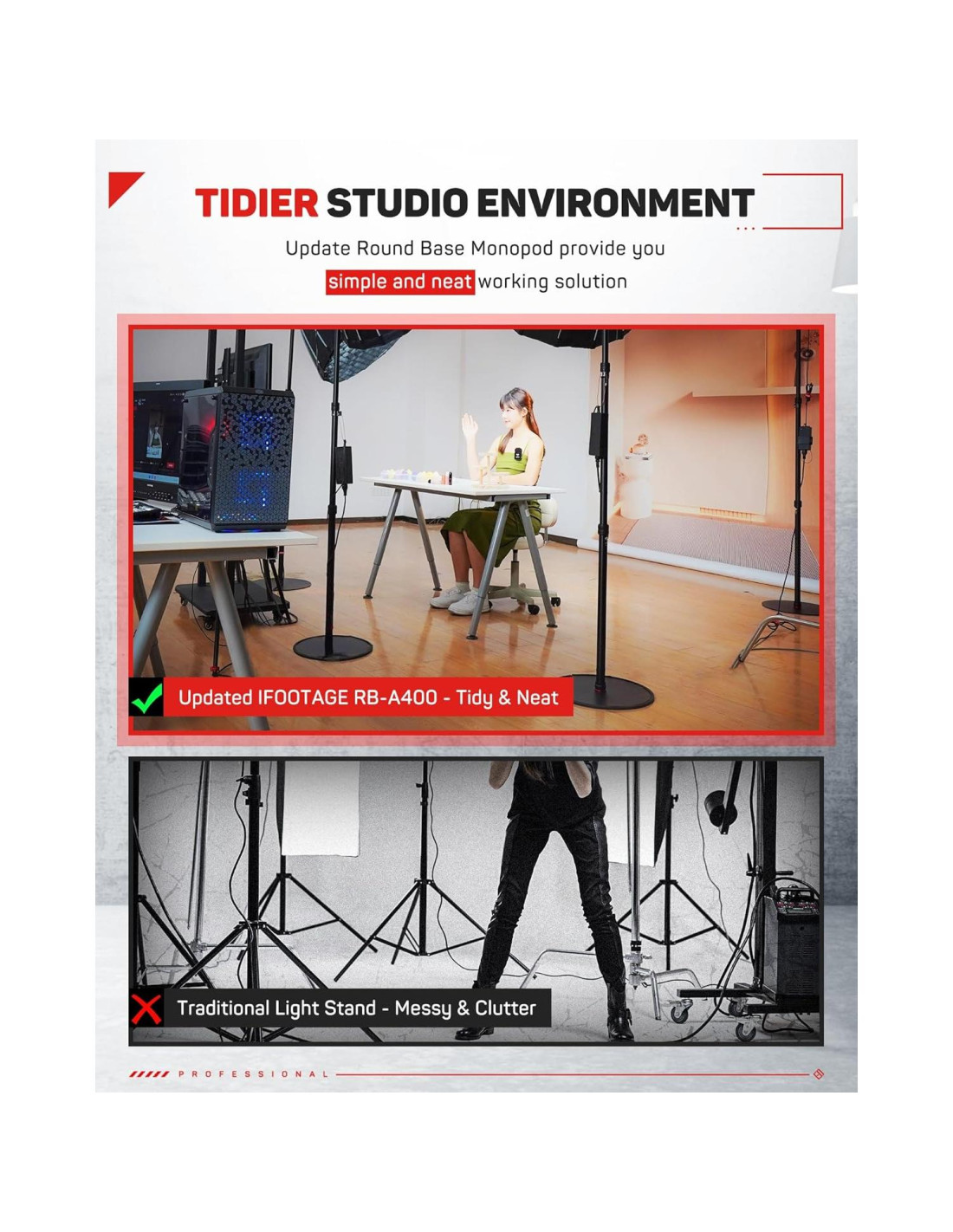- Altura Ajustable y Gran Capacidad: La placa base redonda es ajustable en altura hasta 79", tiene un revestimiento de tela antideslizante y antiarañazos y soportará de manera confiable y sólida tu equipo hasta 22 lbs (9.98 kg). El monopod de base redonda iFootage es la solución perfecta para soportar tus cámaras y accesorios para grabaciones en mesa o escritorio.
