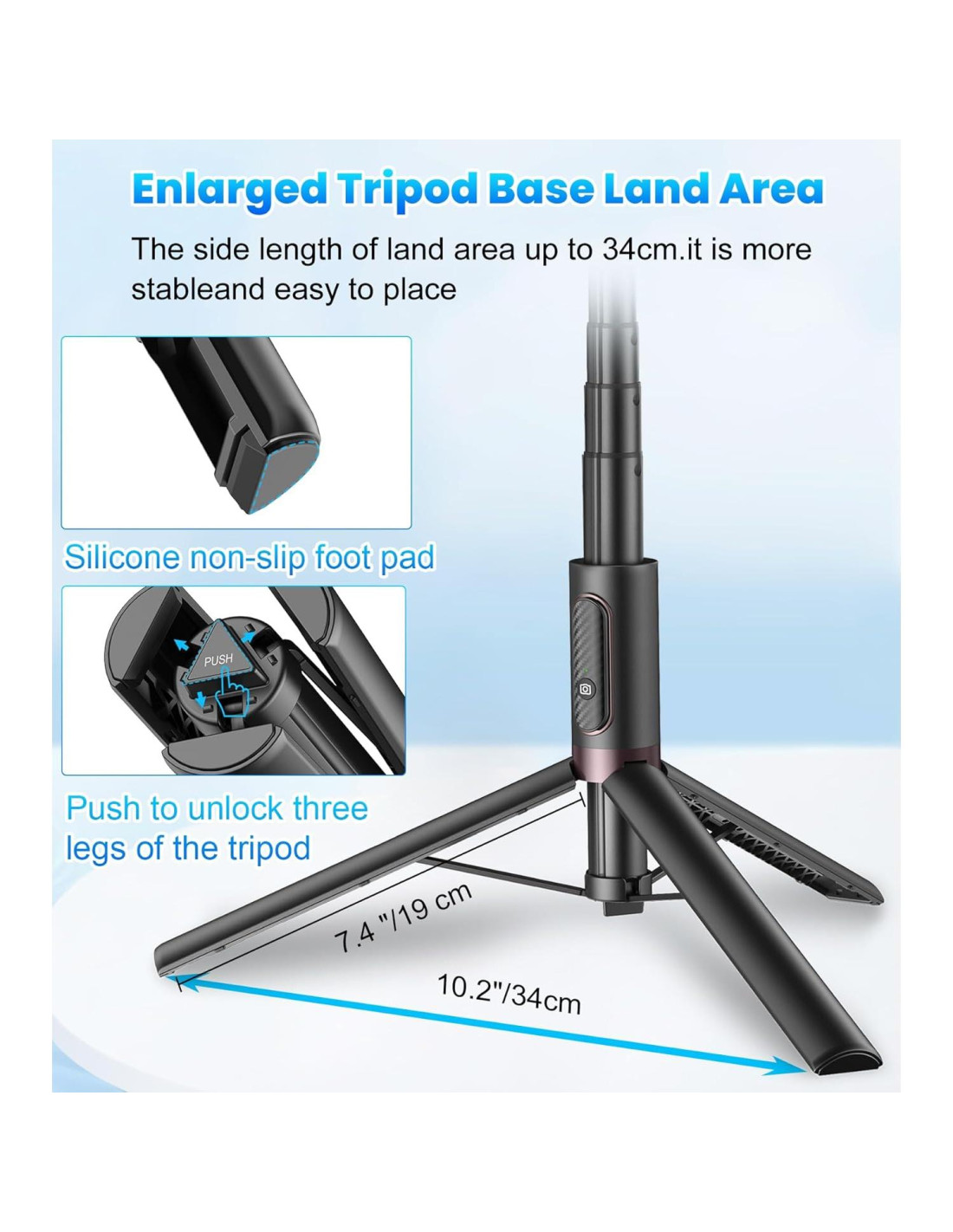 - Base de Trípode Reforzada: Muy fácil de usar, solo presiona el botón en la parte inferior para desbloquear las tres patas del trípode para iPhone. La base del trípode para teléfono recién mejorada adopta un diseño reforzado con una almohadilla antideslizante de silicona, que es más estable después de desplegarse y no es fácil de sacudir. Nota: En el modo trípode, el teléfono debe colocarse en el centro de la pista deslizante, que es consistente con el centro de gravedad del trípode para evitar que se vuelque.