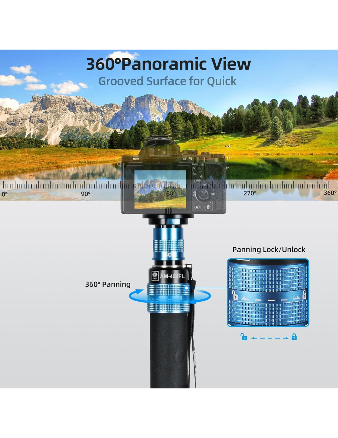 - [Diseño de Panorámica de 360 Incorporado]: El collar superior de giro tiene una superficie texturizada para un giro firme. Desbloquea el collar para obtener una panorámica completa de 360 incluso sin una cabeza de bola.