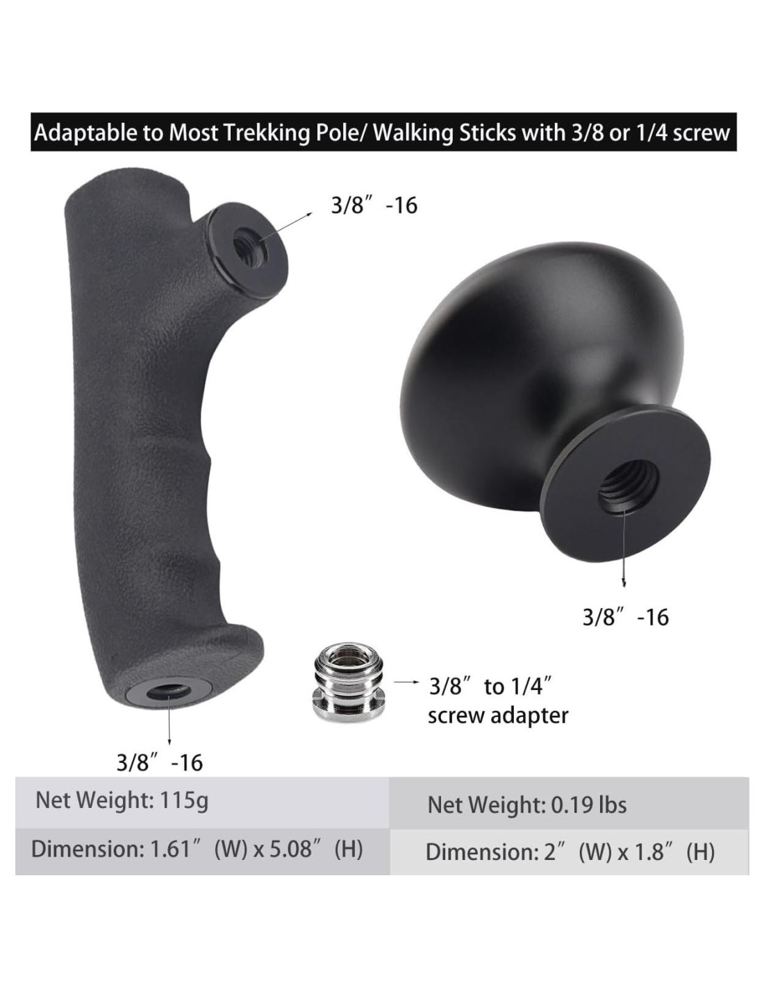 - Adaptable a la Mayoría de Bastones de Trekking/Bastones de Caminata Ambos equipados con orificio de tornillo de 3/8-16 y un casquillo reductor de 3/8 a 1/4, se adapta a monopods de 1/4 o 3/8
