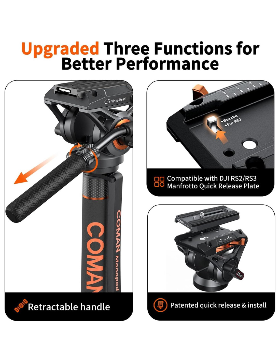 - [Liberación Rápida en 1 Segundo y Ajuste Universal] Acelera tu flujo de trabajo con el sistema de montaje instantáneo para cámara de COMAN. Este monopie para telescopio de liberación rápida funciona sin problemas con placas Manfrotto e incluye un mango retráctil para una operación más suave.