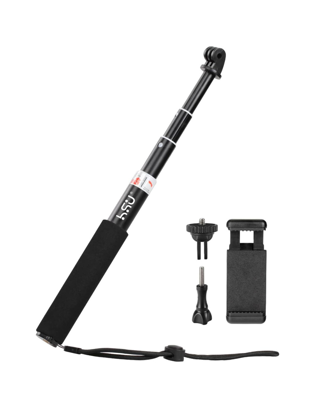 HSU fue establecida en 2013 por un grupo de entusiastas de la fotografía que deseaban más facilidad y comodidad durante la toma de fotos. HSU comenzó con el objetivo de crear equipos de soporte para cámaras versátiles e innovadores que a los clientes les encanten y no puedan esperar para compartir. HSU es una de las marcas de accesorios para cámaras de acción más populares en Amazon. Desde su listado en Amazon, los productos de HSU han recibido numerosos comentarios positivos de nuestros clientes y algunos accesorios profesionales para cámaras de acción están clasificados como los más vendidos de Amazon. Solo 20.1 centímetros de tamaño plegado, 104g (0.23 lb) de peso, el selfie stick es conveniente para que lo pongas en tu bolsillo o bolsa, portátil para llevar a todas partes. El Selfie Stick permite ajustes rápidos de longitud de 20.1 cm a 57.4 cm, simplemente gira en sentido contrario a las agujas del reloj para liberar, elige la longitud deseada y gira en sentido horario para bloquear, te ofrece el efecto de disparo óptimo. Hecho de tubo de aluminio impermeable y a prueba de óxido para permitirte disfrutar de todos los deportes acuáticos. (Por favor, enjuágalo con agua dulce y sécalo después de cada uso en agua salada) (No Flotante) 1 x selfie stick 1 x soporte para teléfono celular 1 x montura para trípode 1 x tornillo de mariposa 1 x correa de muñeca