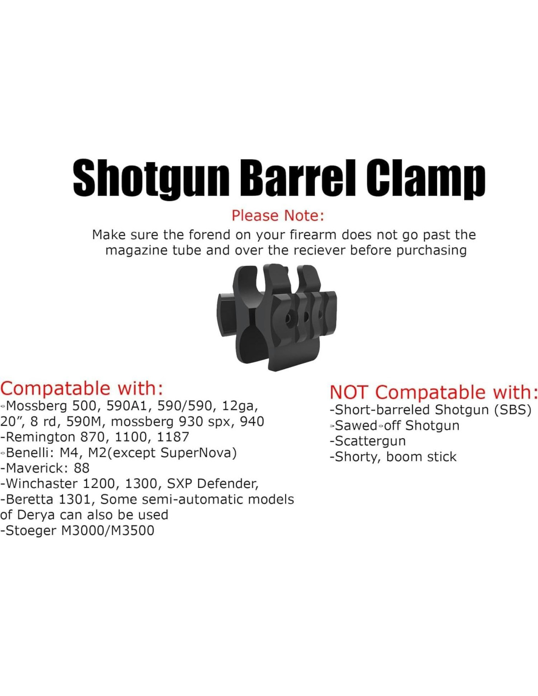 - 2 piezas de juntas de abrazadera de cañón de 4x6 mm de elastómero de silicona incluidas para proporcionar una capa protectora entre los componentes de la abrazadera, el cañón de la escopeta y el tubo del magazine.