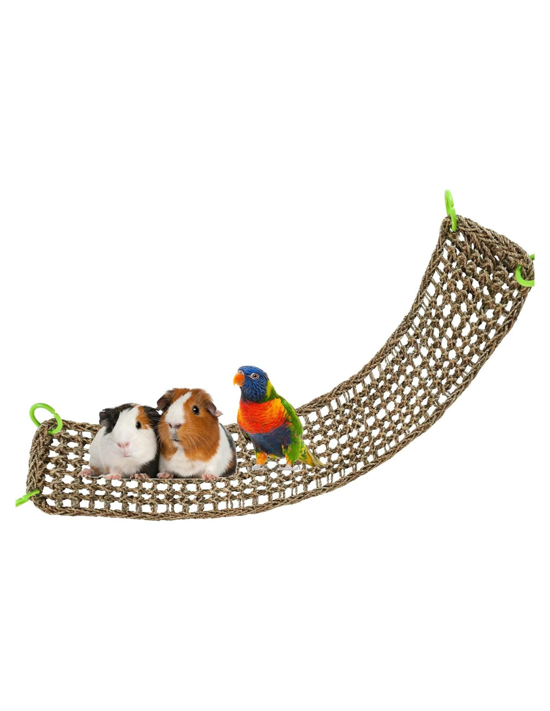 - [Decora Jaula o Acuario] : Basado en la hamaca de alfombras de hierba marina para pequeños animales, puedes agregar algunos juguetes o bocadillos que le gusten a tu mascota, para construir sus parques de juegos, ejercitar su coordinación y equilibrio, y enriquecer su vida en la jaula. También puedes optar por enrollar o doblar la almohadilla de algas para construir un refugio para pequeños animales.