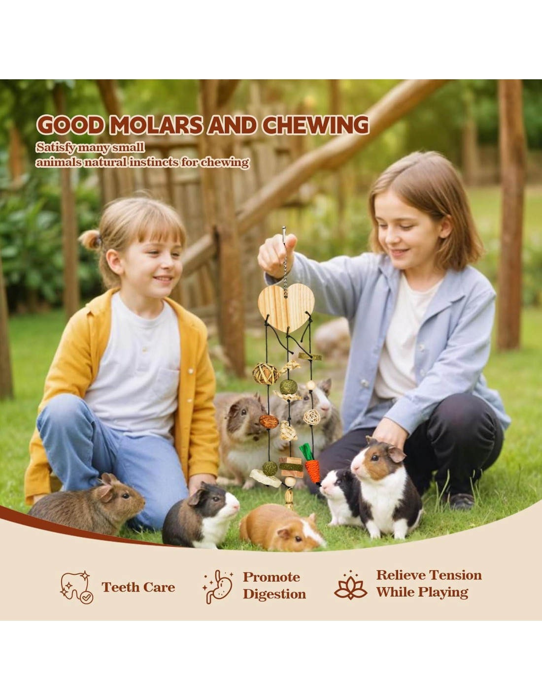 - Mantener los Dientes Saludables: Los juguetes de masticar para cobayas en la jaula son perfectos para el desgaste de los dientes de los animales pequeños y también se pueden masticar de forma segura. Las golosinas para hámsteres de materiales naturales pueden proteger el crecimiento saludable de los dientes de sus mascotas y evitar problemas orales causados por el crecimiento excesivo de los dientes, así como prevenir que muerdan su jaula y otros muebles. Las golosinas para conejos pueden mantener los dientes de sus mascotas limpios y saludables y aliviar el dolor de los dientes excesivamente largos.