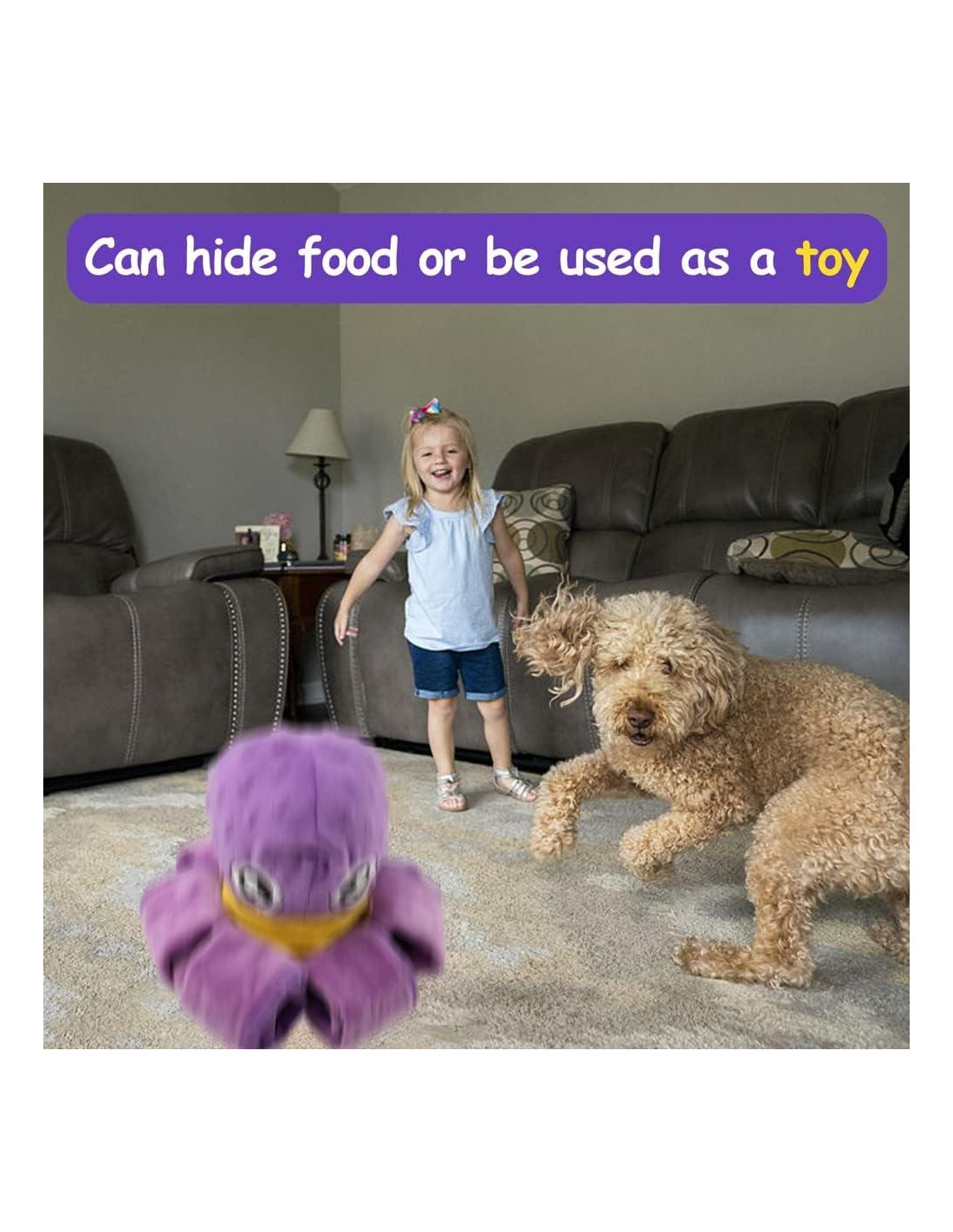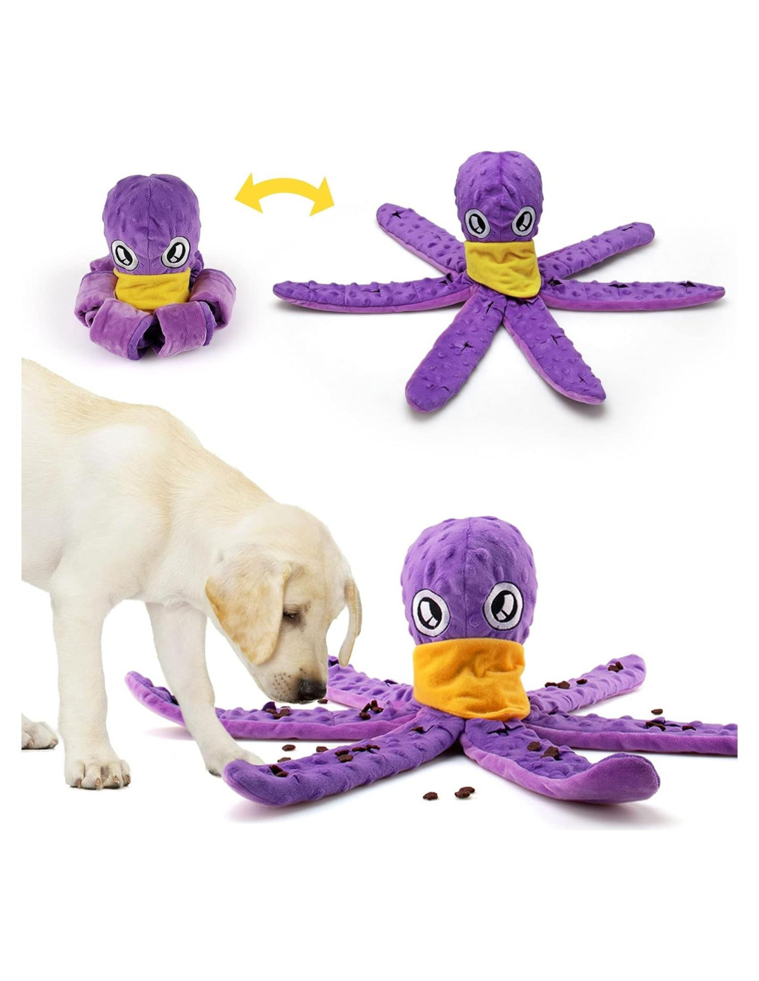 - [JUEGO DE "OLFATEO" DIVERTIDO] Los nuevos juguetes de enriquecimiento para perros en forma de pulpo son adecuados para cachorros, un producto único que combina juego, mordida, olfato y comida, lo cual es raro en el mercado. El juguete de olfateo para perros tiene seis garras largas y cada una está diseñada con tres pequeños agujeros para esconder comida para perros, de modo que el perro pueda encontrar comida por el olfato. Se cose velcro en las patas del juguete chirriante en forma de pulpo. Puedes enrollar o desplegar tus patas para esconder comida para perros y hacer que el juego de olfateo del perro sea más interesante.