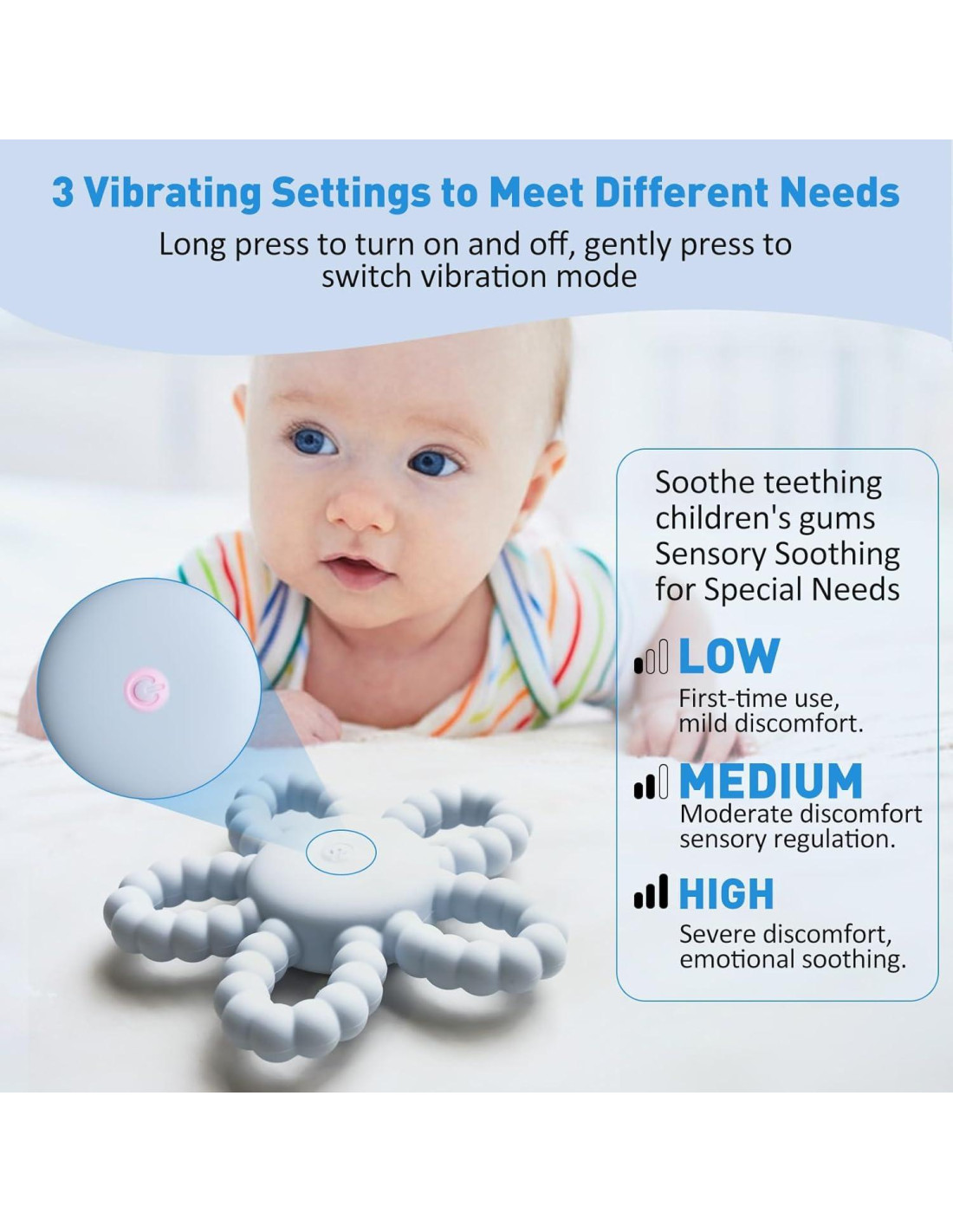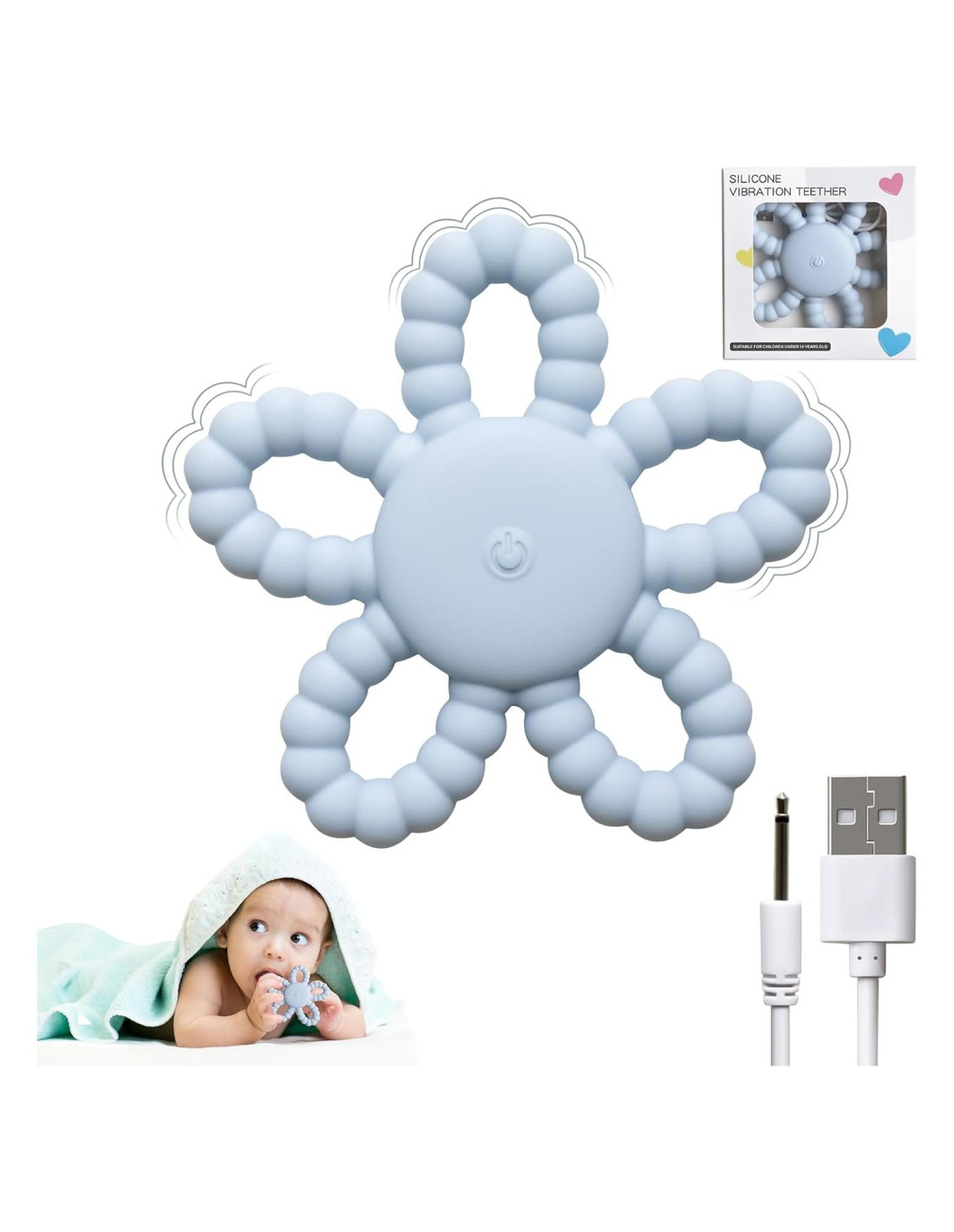 - 3 Configuraciones de Vibración y Carga Rápida por USB. Nuestros juguetes de masticar sensoriales orales para niños tienen 3 configuraciones de vibración, suaves vibraciones de nuestros anillos de dentición para adaptarse a bebés de 3 6 9 12 18 meses, permiten que el bebé se calme durante el proceso de dentición. Funcionalidad de carga USB segura y rápida, ideal para que los bebés jueguen regularmente.