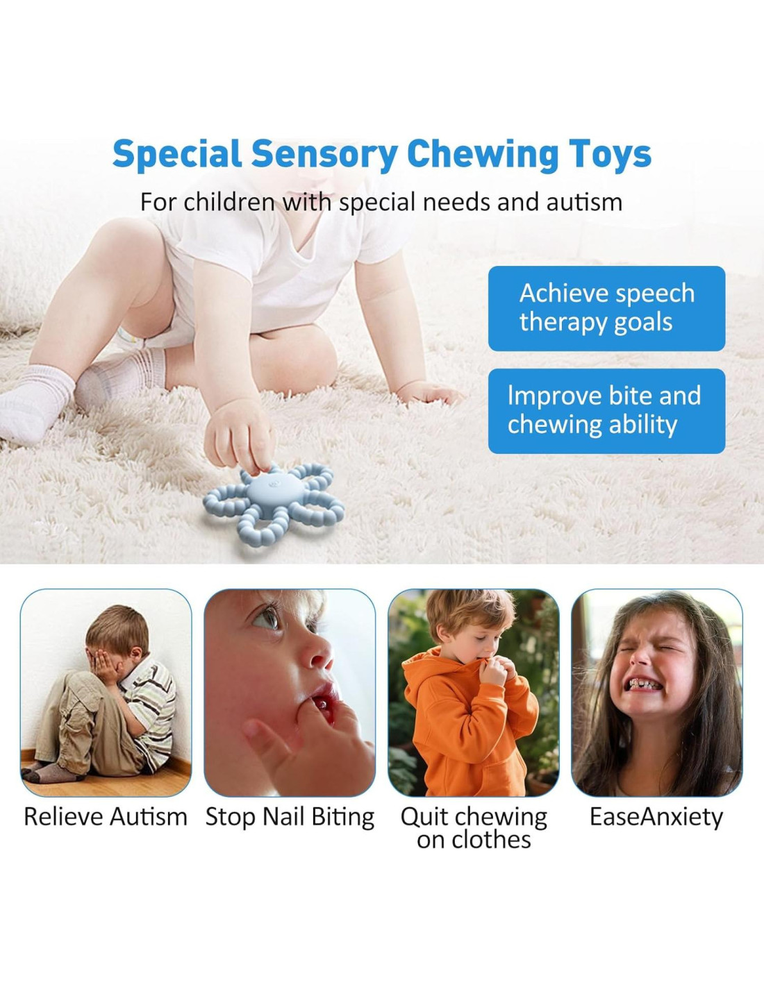 - 100% Materiales Seguros. Nuestros productos sensoriales para autismo están hechos de silicona de grado alimenticio, asegurando la seguridad y durabilidad de los juguetes de masticar para su bebé y cumplen con los más altos estándares de calidad que necesita todo bebé.