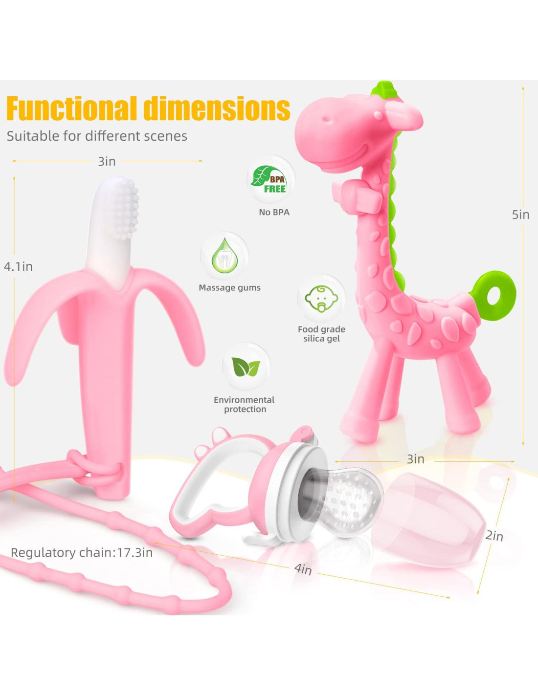 - Paquete incluido: Recibirás 1 mordedor de jirafa, 1 mordedor de plátano, 1 chupete con 3 sacos de silicona y 1 caja de almacenamiento
