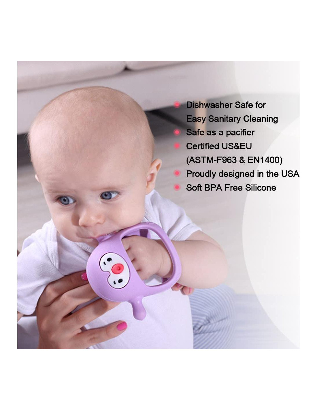 - Fácil de Lavar y Sostener Mordedores de Silicona para Bebés: Los mordedores para bebés están hechos de silicona de grado alimenticio libre de BPA. Es fácil de limpiar y almacenar. Lávalo bajo agua corriente y enjuágalo, su tamaño pequeño lo hace fácil de llevar en la bolsa de pañales para llevar. También es un juguete perfecto para la silla alta y el asiento del automóvil para mantener a los bebés entretenidos y ocupados mientras los padres están ocupados.