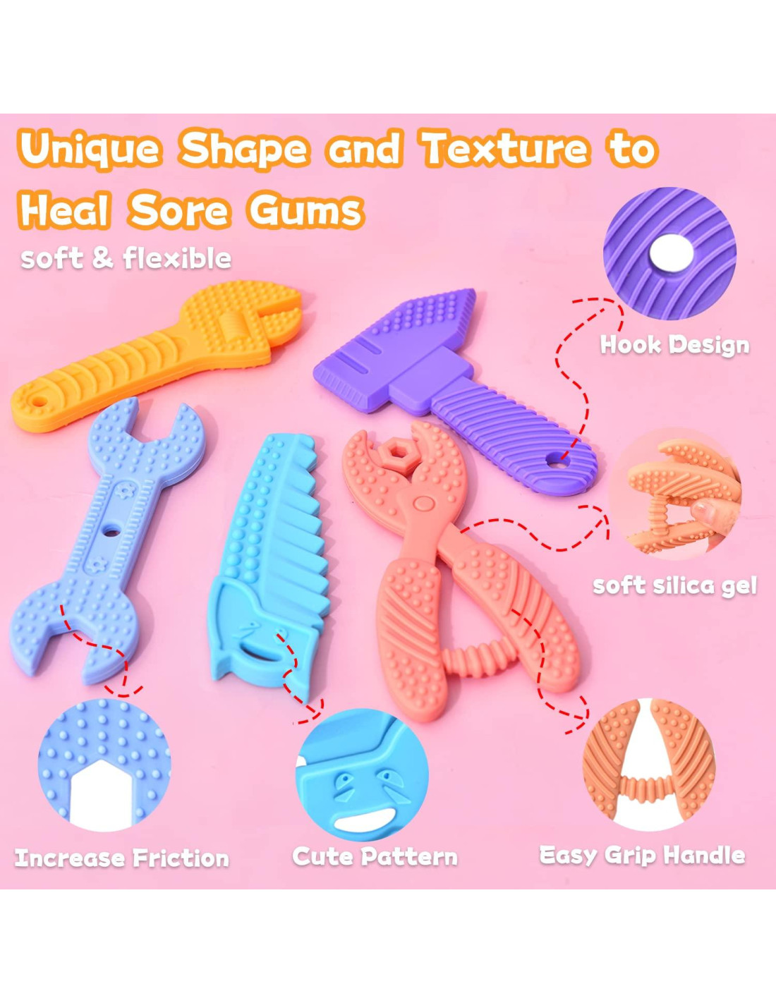 - [Set de Dentición] En este paquete, su bebé recibirá un juguete de dentición con cinco diseños y formas de herramientas diferentes y una cadena anti-caída. La gutapercha es de color brillante y forma novedosa. Puede mejorar el reconocimiento de colores y la capacidad cognitiva del bebé. La cadena anti-caída se puede sujetar a la ropa del bebé para evitar que se caiga al suelo durante su uso.