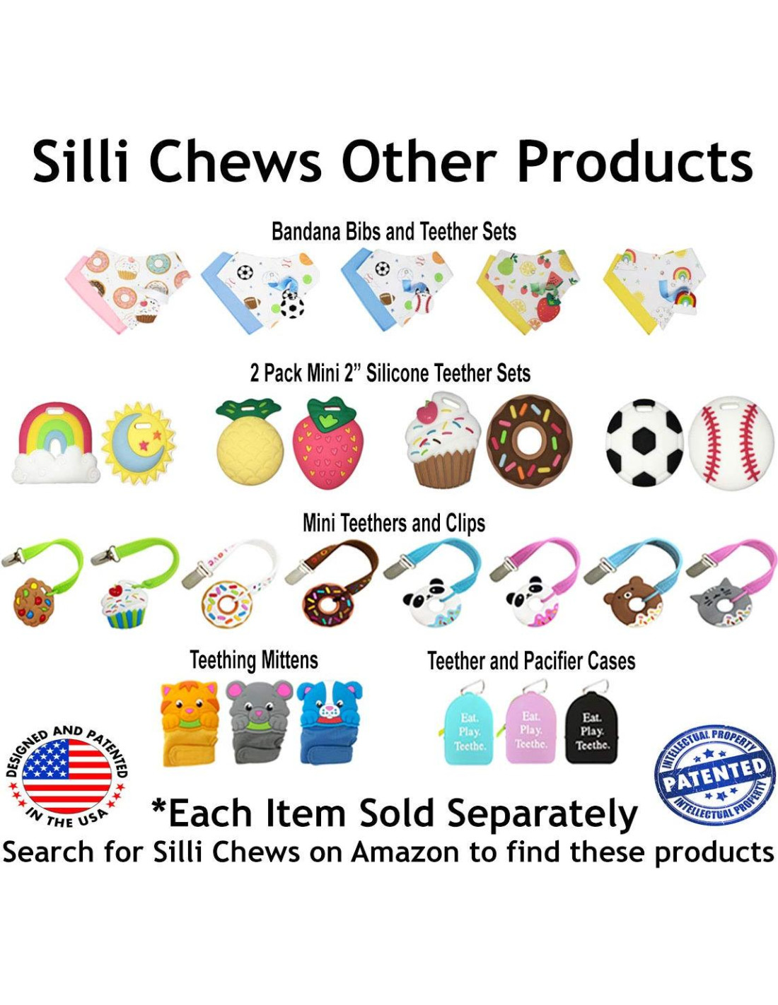 - POR QUÉ SILLI CHEWS: añade un poco de "silli" a la dentición. Los chupetes Silli Chews están hechos a mano para todas las etapas del proceso de dentición y presentan personajes dulces, tontos y juguetones y objetos cotidianos divertidos en colores vibrantes y llamativos. Estos diseños originales de chupetes de silicona "calmarán y entretendrán" a tus bebés.