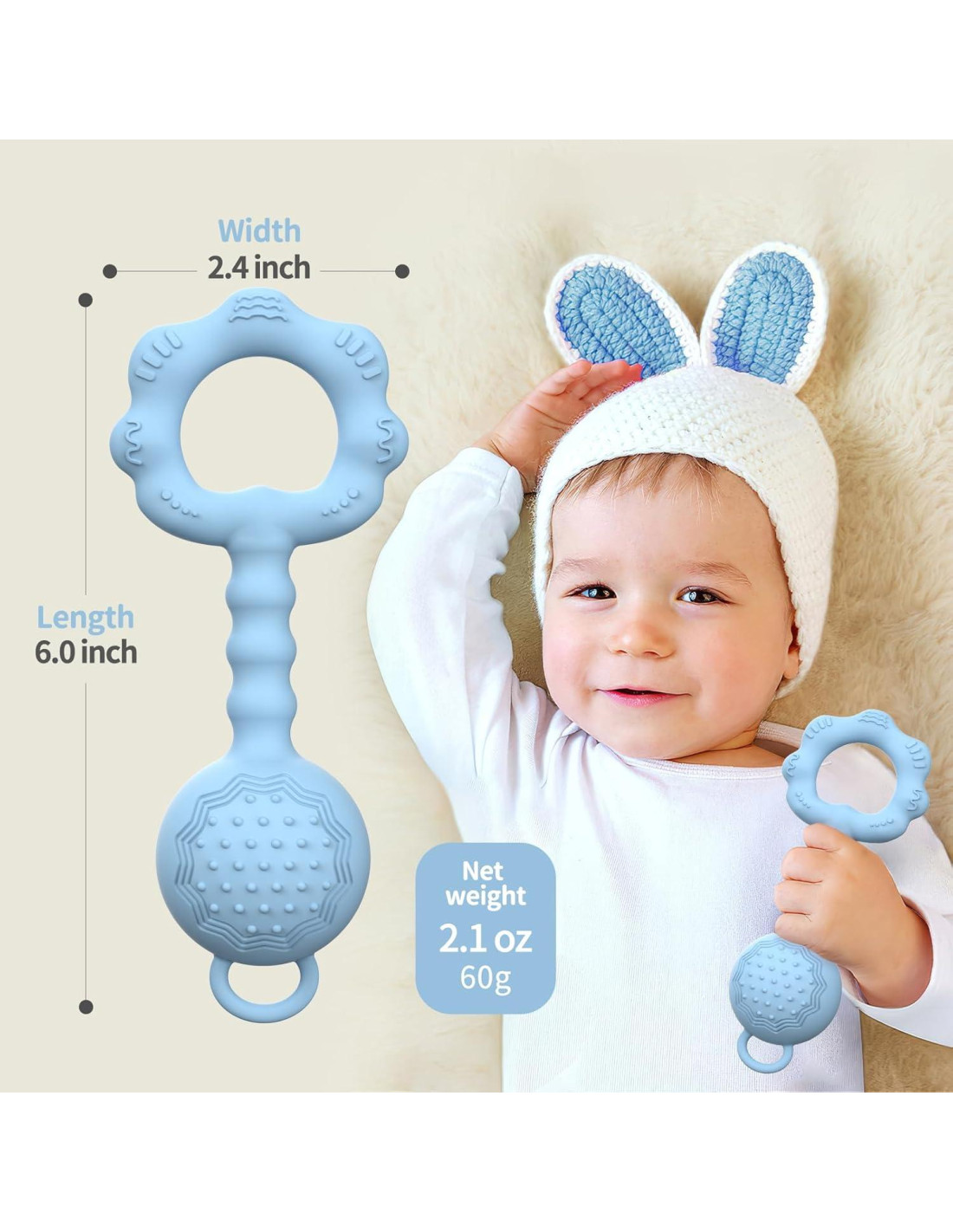 - - Seguro, Duradero y Cómodo: Hecho de silicona de grado alimenticio, nuestros mordedores sonajeros son libres de tóxicos así como libres de BPA. Los bordes suaves y pulidos aseguran que no haya astillas, y el diseño ligero y fácil de sostener los hace perfectos para que las pequeñas manos los agarren y para que el bebé los muerda. Estos mordedores son anti-deformables y pueden prevenir que los niños se atraganten, creando una experiencia cómoda y sin preocupaciones para usted y su bebé.