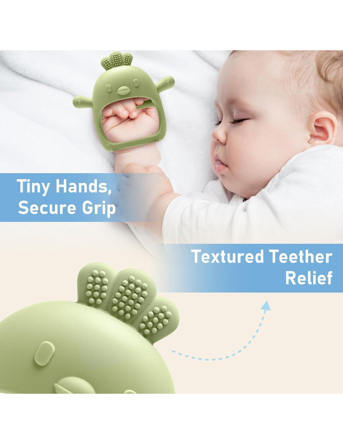 - [Juguete de Desarrollo Montessori] Nuestro juguete de dentición para bebés presenta un diseño brillante y ligero que captura instantáneamente la atención de tu pequeño. Los adorables mitones de dentición en forma de pollito se ajustan perfectamente a las manos pequeñas, haciéndolos fáciles de agarrar y masticar. Adecuado para bebés de 0-3 3-6 6-12 12-18 meses.