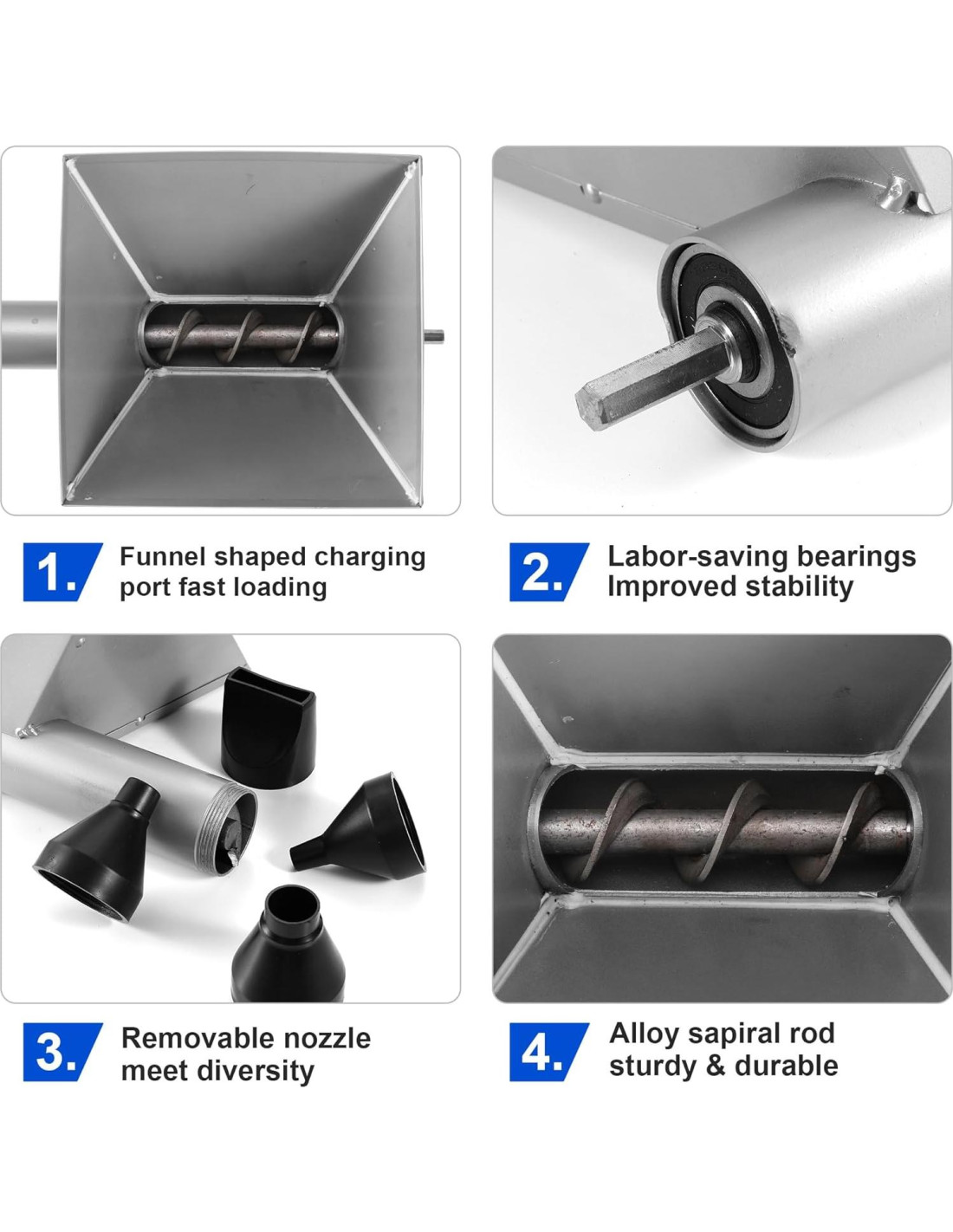 - Multifuncional: Esta pistola de mortero viene con 4 boquillas desmontables, puedes cambiar fácilmente entre diferentes escenarios de aplicación. La versatilidad proporcionada por las múltiples boquillas permite una aplicación precisa y eficiente de grout y mortero, haciéndola la elección perfecta para todas tus necesidades de grouting.