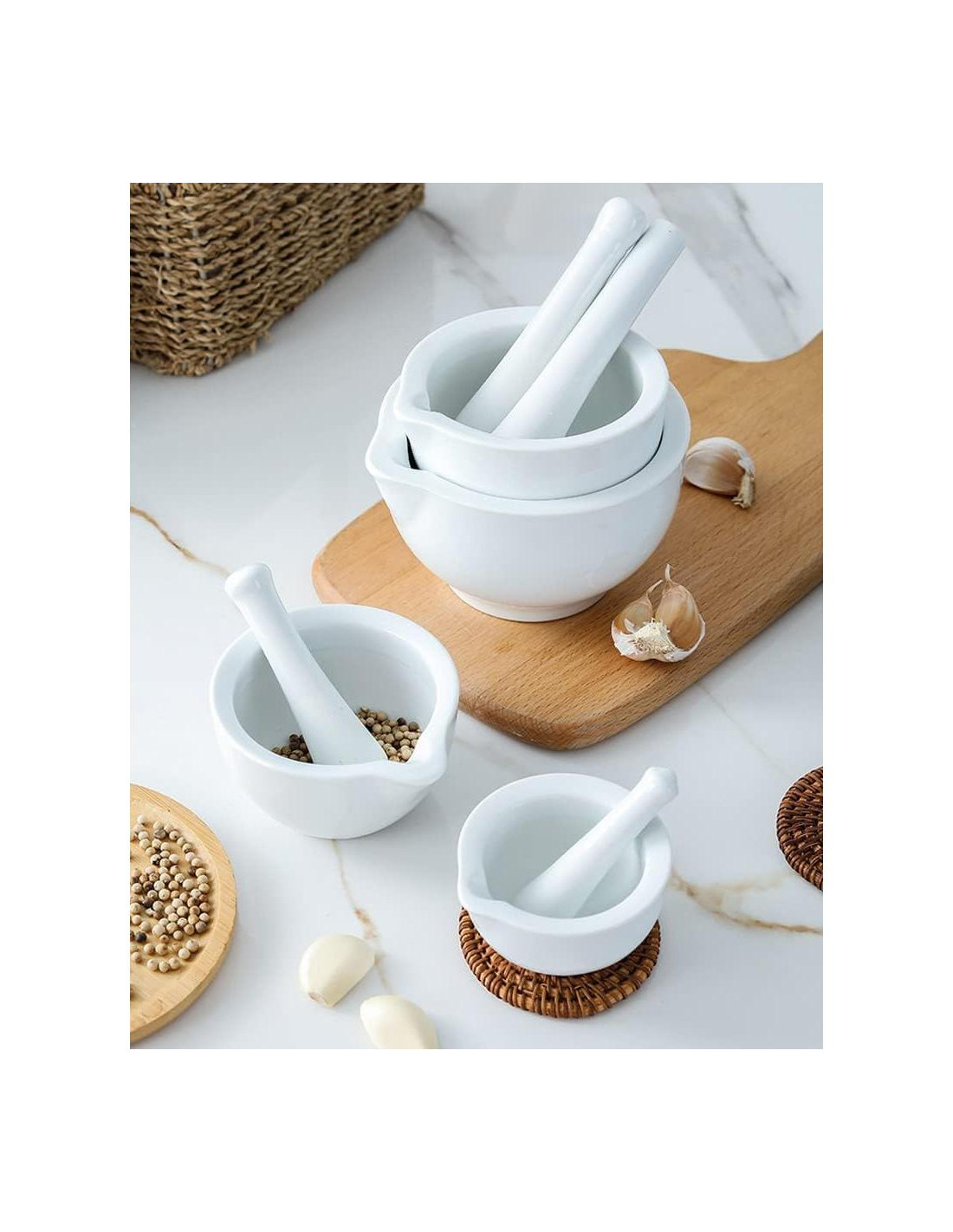 1. Todas las partes son blancas, lo que se adapta bien a la cocina, tamaño pequeño, hermoso y generoso, y se puede colocar en cualquier lugar de la cocina. 2. Hecho de cerámica, seguro e higiénico, muy duradero. 3. Ideal para moler especias, hierbas, medicina u otras sustancias. 4. La textura interna esmerilada puede aumentar la fricción, mejor para moler. 5. Agarre cómodo, fácil de limpiar. Característica: Color: Blanco Material: Cerámica Tamaño: altura 4.8 cm (1.89 pulgadas), ancho: 8 cm (3.15 pulgadas) Paquete incluye: 1 x Mortero 1 x Mano