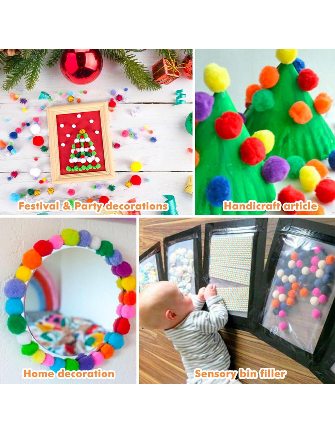 - Las bolas pom pom multicolor se pueden usar para hacer varias manualidades como juguetes, guirnaldas, collares, colgantes, decoraciones de vestidos, etc., así como accesorios decorativos, cubiertas de álbumes para bebés y pinturas decorativas.