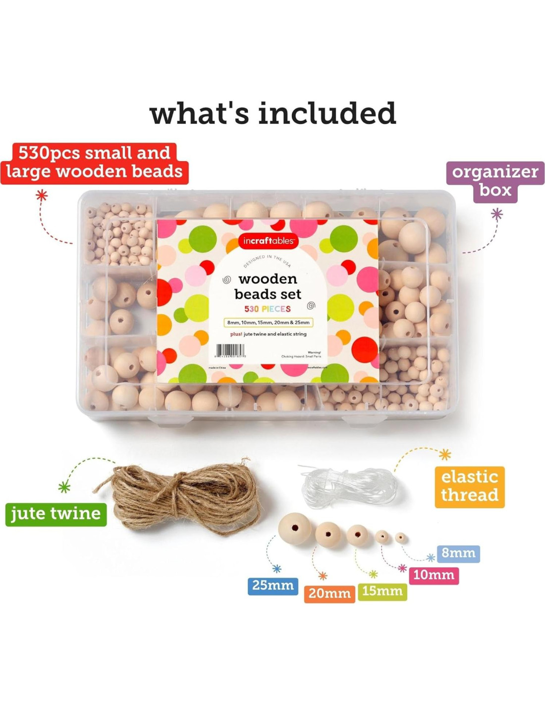 - PAQUETE DE VALOR DE PERLAS DE MADERA PARA MANUALIDADES - Incluye 530pcs de perlas de madera sin terminar en tamaños variados: 200pcs 8mm, 150pcs 10mm, 100pcs 15mm perlas de madera, 50pcs 20mm perlas de madera y 30pcs 25mm perlas de madera. Viene con cuerda de yute, hilo elástico y caja organizadora.